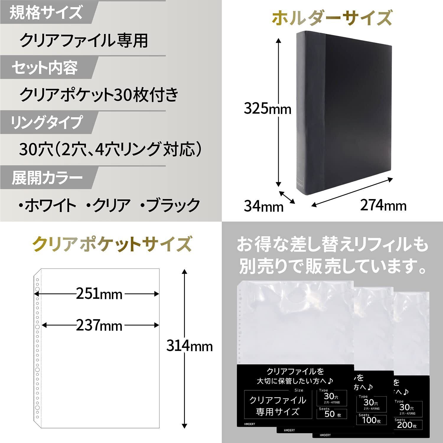 【カラー】クリア 【サイズ】[ホルダー:サイズ:縦325mm×横274mm×背幅34mm / クリアファイル収納サイズ / 30穴リング式バインダー] ・ [クリアポケット:縦314mm×横251mm(収納サイズ:縦314mm×横237mm) クリアファイル収納サイズ / 30枚入り/30穴(2穴、4穴リング対応)] ▲注意事項▲クリアポケットの大きさは、幅広い種類の未開封OPPサイズに適応しているためクリアファイル本体のみをピッタリと収納したいとお考えの方には向きませんので、あらかじめご理解いただけますと幸いです。