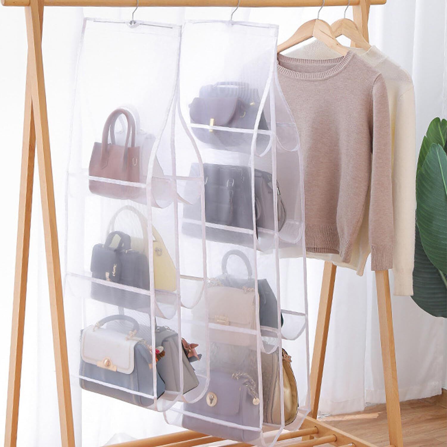 クローゼットのバーに掛けるだけの簡単取り付け!すぐに使えるため、忙しい日々の中でも手間いらずで、バッグの出し入れもスムーズに行えます。
