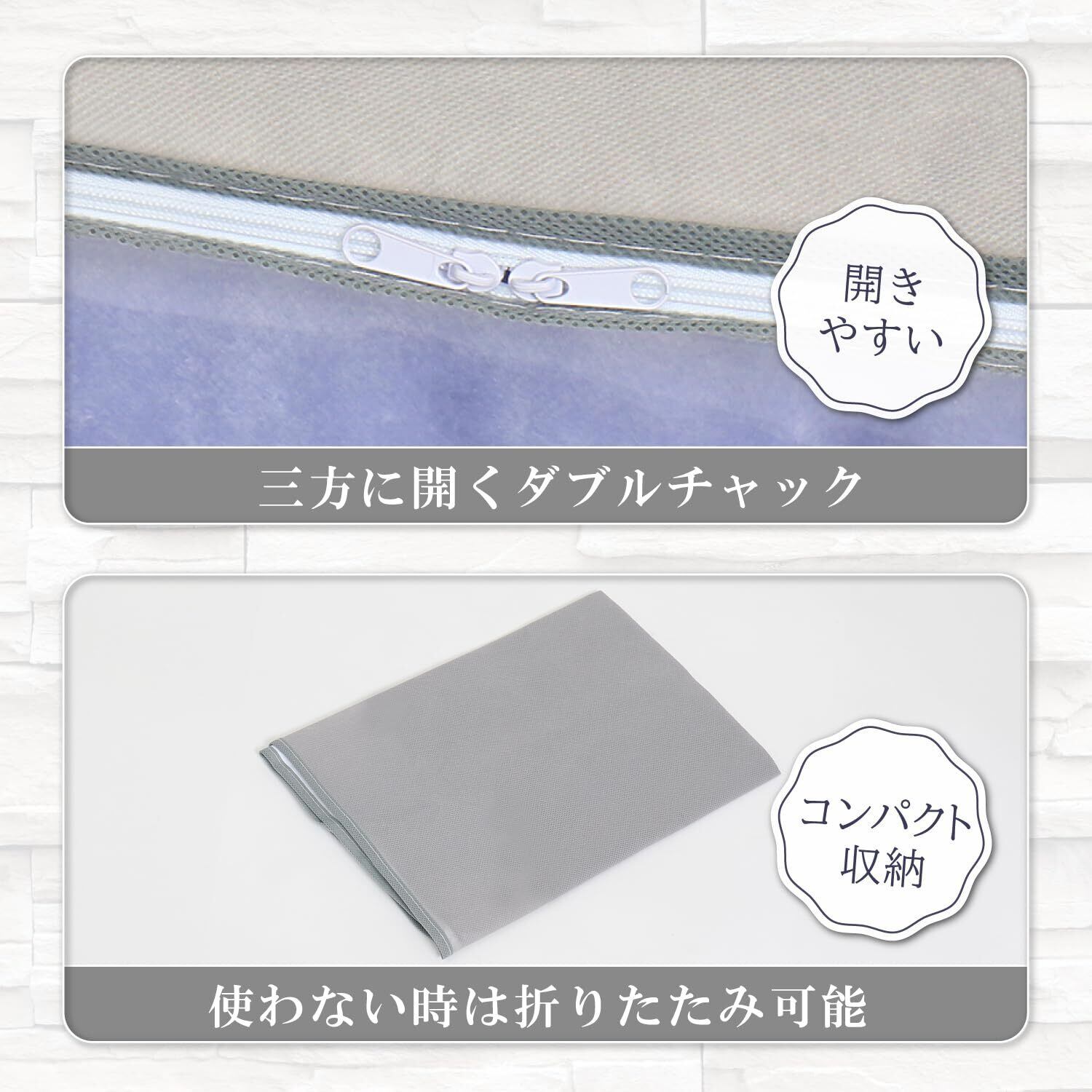 この収納ケースは2枚組なので、複数の布団や軽寝具をまとめてしっかり収納できます。押し入れやクローゼットのスペースを有効活用し、すっきりと整理整頓された空間を実現します。
