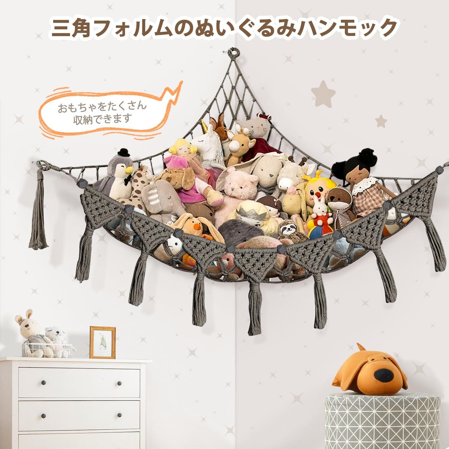 【ぬいぐるみ収納ネット】可愛らしいぬいぐるみ収納ネットは、サイズ(約100×100×150cm)のこのトイネットは、最大50個のぬいぐるみを収納でき、床のスペースを確保し、散らかりを防ぎます。コーナーにぴったり収まる設計で、柔軟に設置可能なこのハンモックは、まさに救世主のような存在です。