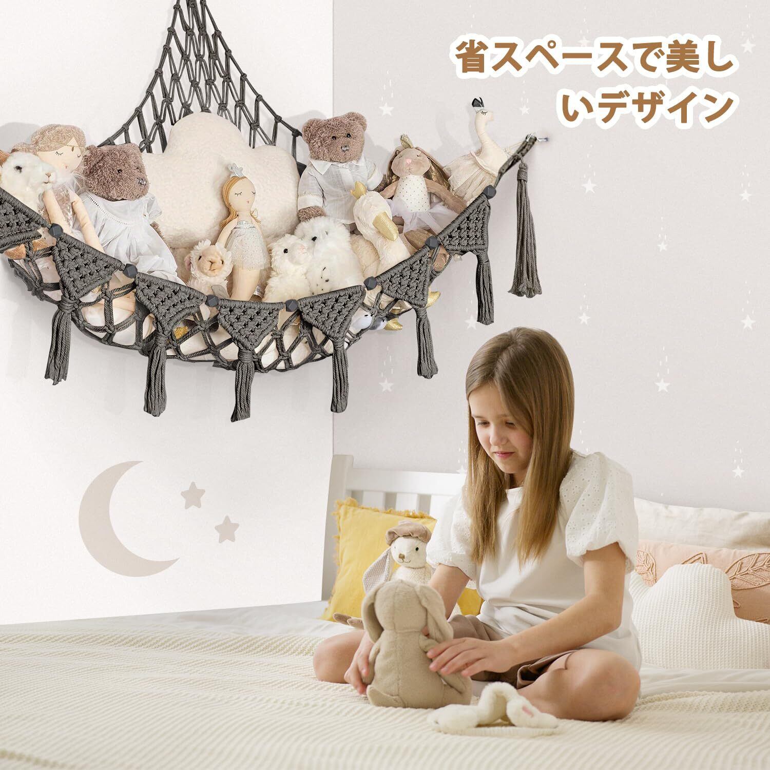 この収納ネットは、見た目もおしゃれで、機能性だけでなく美しさも追求したアイテムです。ぬいぐるみやおもちゃが並ぶ姿は、部屋のアクセントとなり、インテリアの一部としてもお楽しみいただけます。