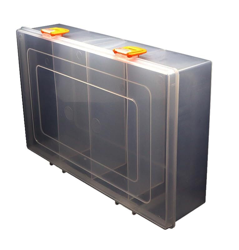 大型止具でがっちりロックできるので、縦置き収納可能で自立もできます。BOXは上に積み上げて保存も可能です。