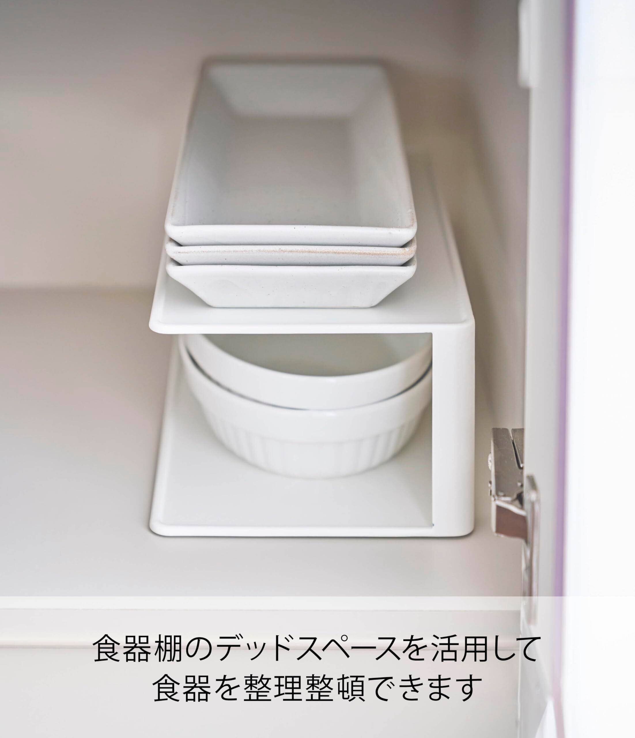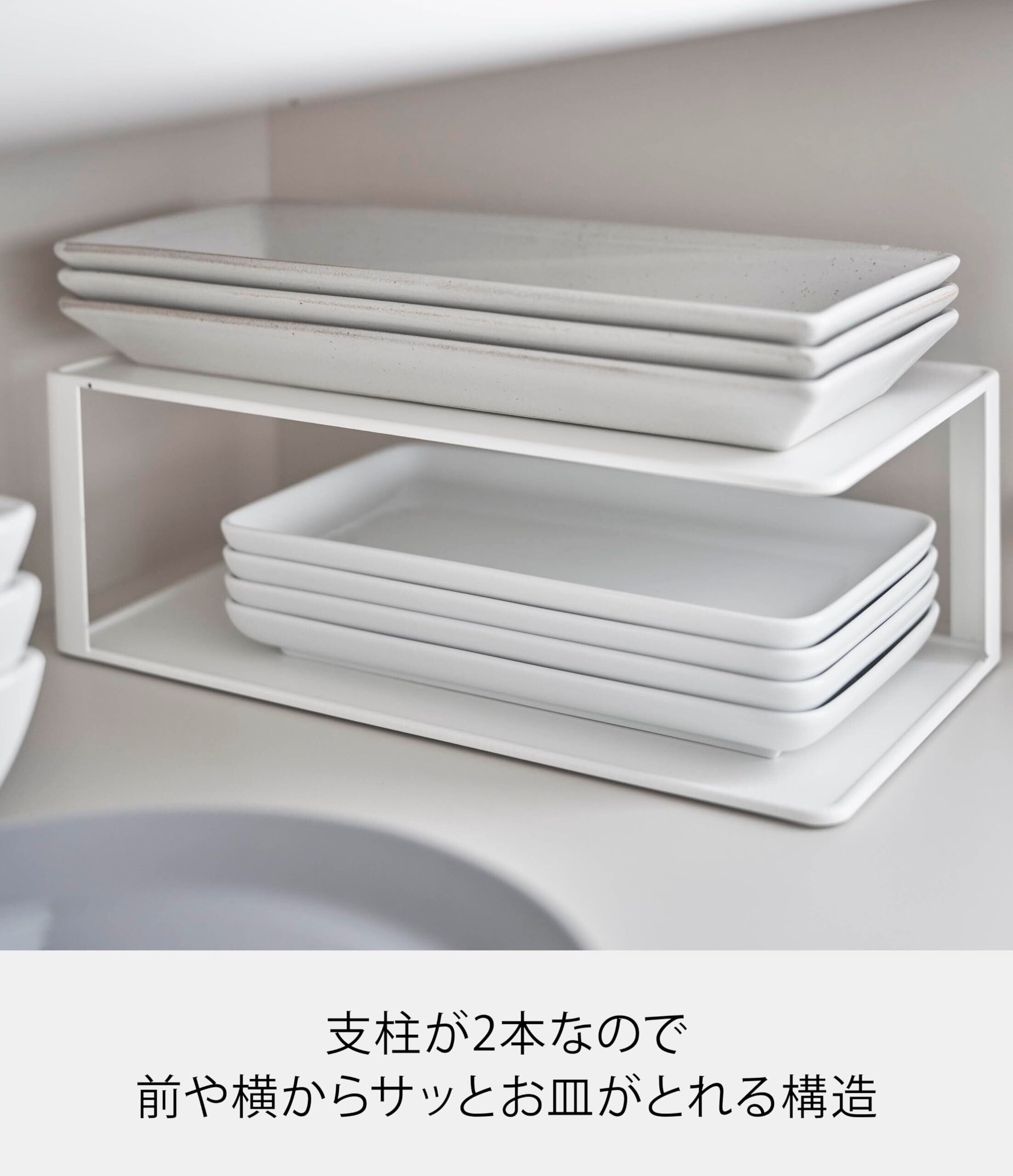 【お皿整理の新しいスタイル!】『山崎実業 長皿収納ラック』は、2段構造でデザインされたお皿専用の収納ラックです。ホワイトのシンプルなデザインが、どんなキッチンにもマッチし、収納するお皿をさりげなく引き立てます。