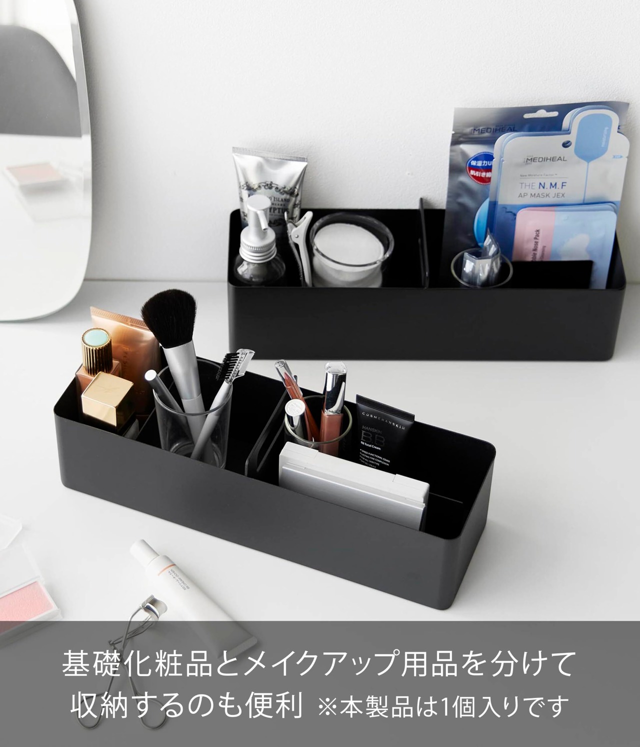 2個使用して、基礎化粧品とメイクアップ用品を分けて収納するのも便利です。