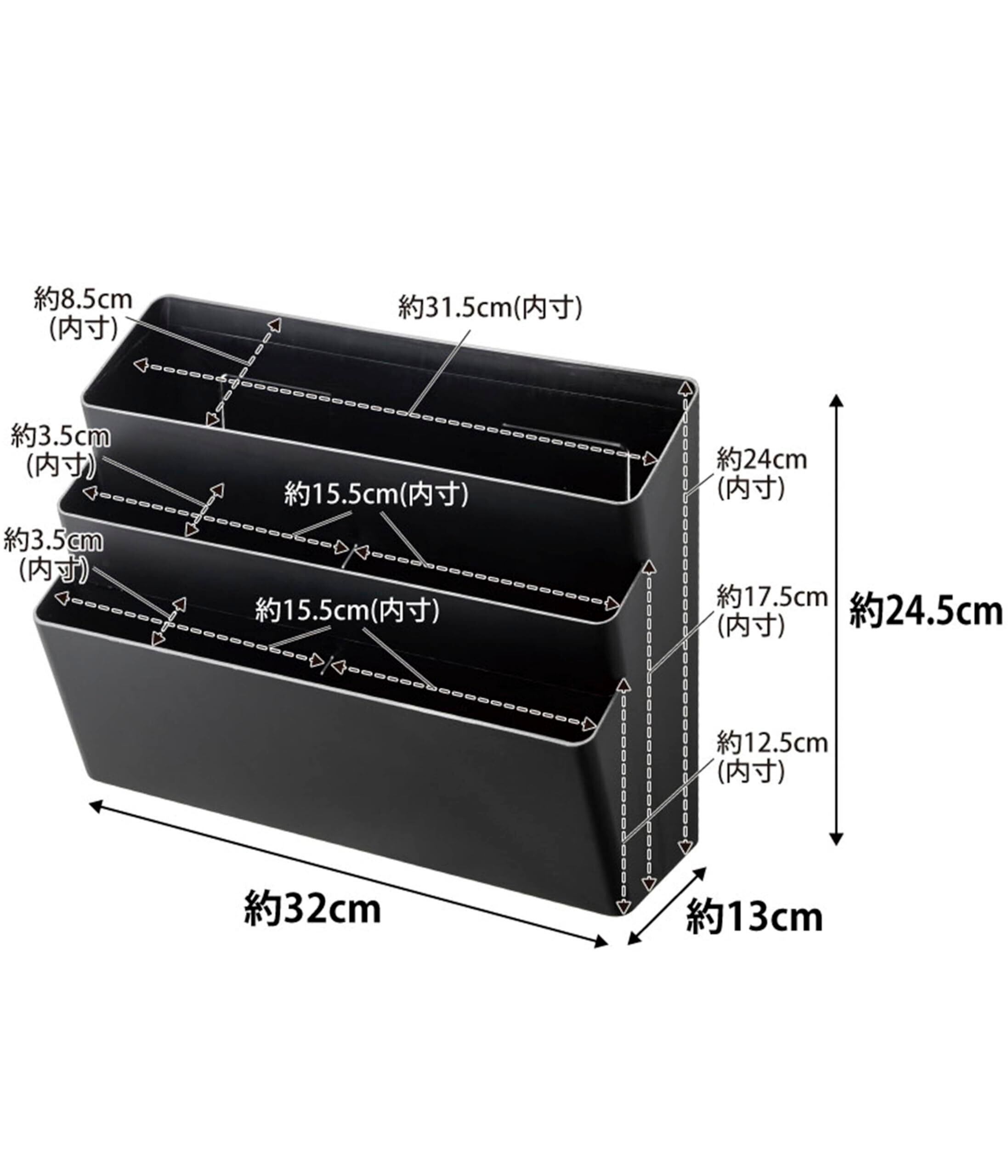 内寸:ポケット部分:上段開口部約W31.5×D8.5×H24cm 中段(左右とも)約W15.5×D3.5×H17.5cm 下段(左右とも)約W15.5×D3.5×H12.5cm