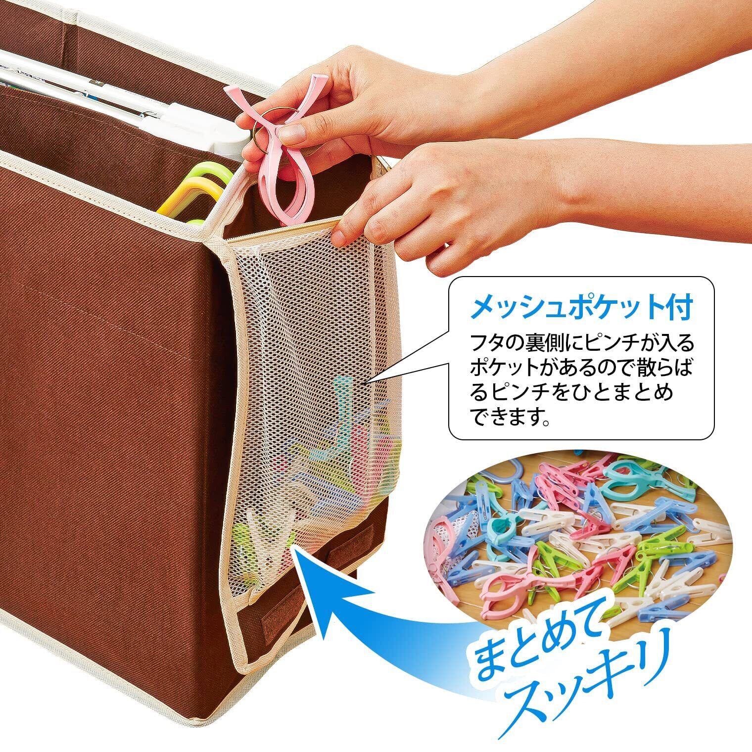 【洗濯用品をまとめてスッキリ収納】こまごまとして散らかりがちな洗濯用のハンガーから大型のピンチハンガーまでひとつにまとめてスッキリ収納!仕切りが付いているので、ハンガーとピンチハンガーを分けて収納できます。フタの裏側には洗濯バサミが入るメッシュポケット付き。
