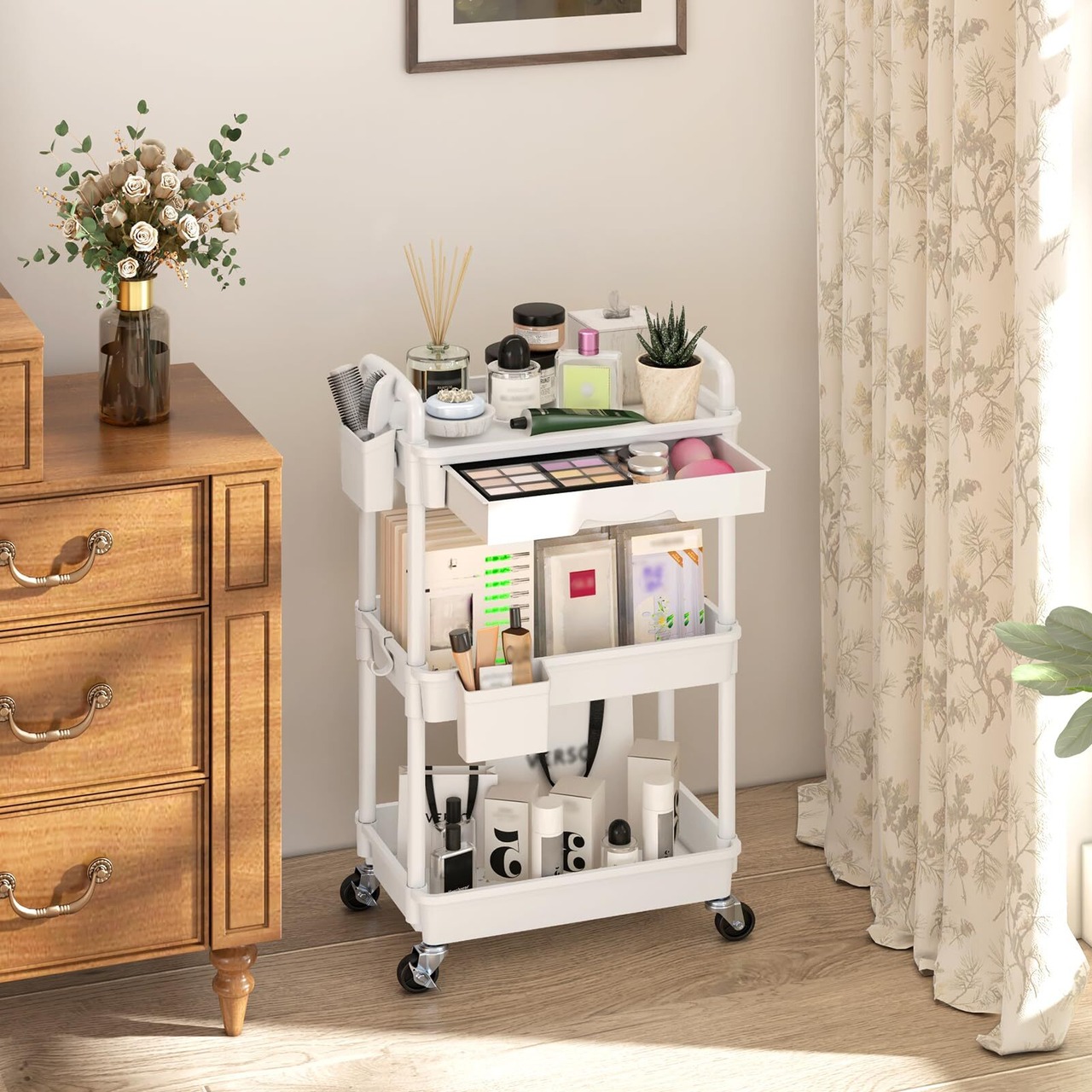 この収納ワゴンは、3段の引き出しを備えており、大きなアイテムから小物までしっかり収納できます。引き出しには仕切板もついており、中身の整理が簡単に行えます。必要なものがすぐに見つかり、ストレスのない生活をサポートします。
