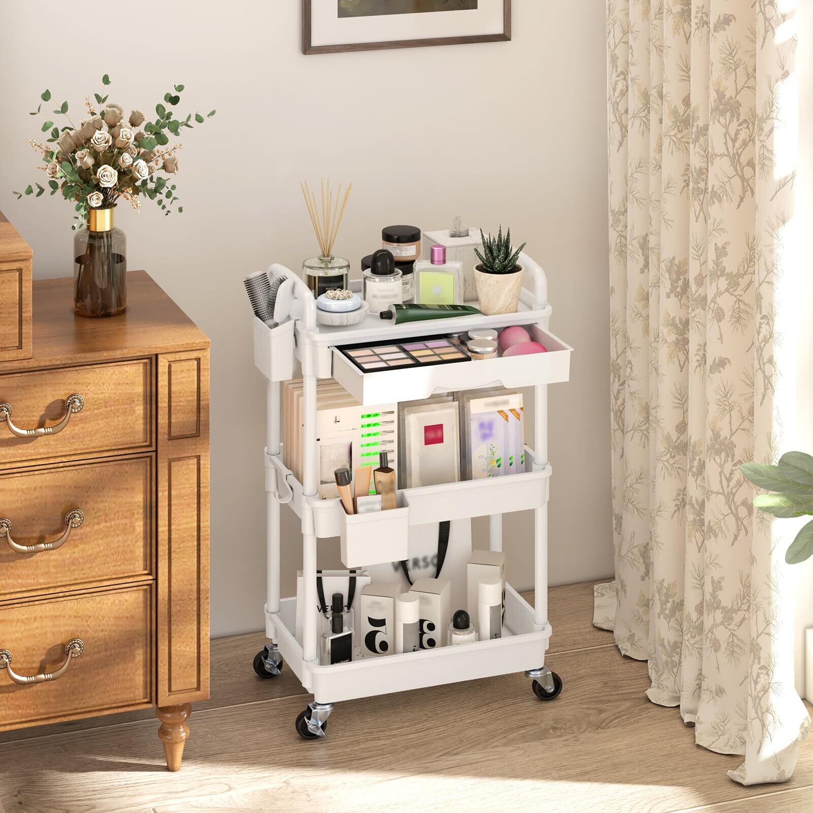 ◆[Goovilla キッチンワゴン ローリング 3段 引き出し付き ハンドル付き 収納カップ 仕切板付き 多機能 小物 隙間収納 バスケットラック バスルーム オフィス キッチン用 収納ワゴン 幅37.8×奥行26.9×高さ75.9cm ホワイト] すっきり収納で快適な空間を!◆