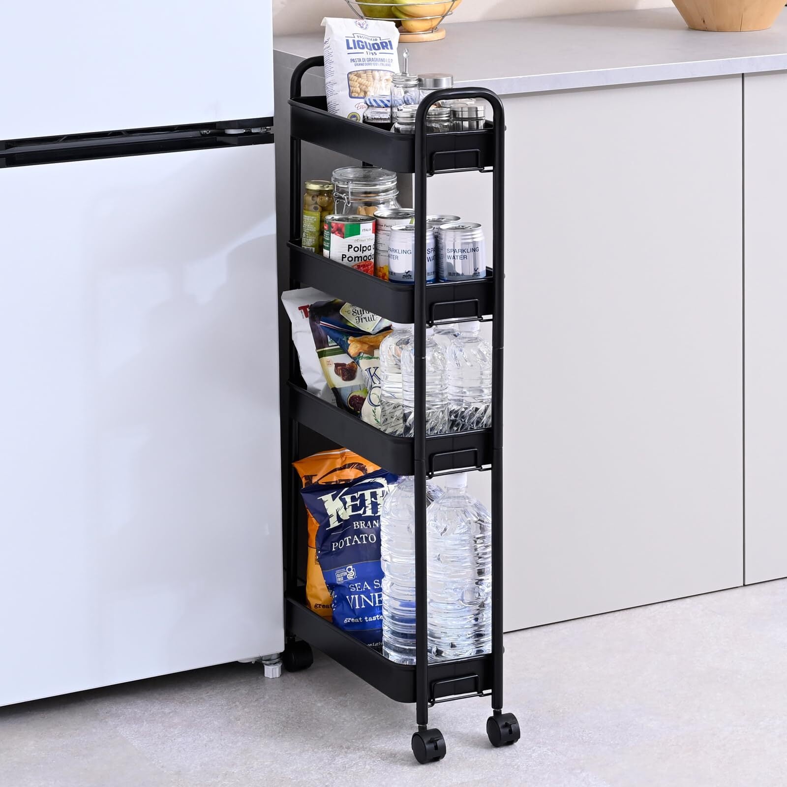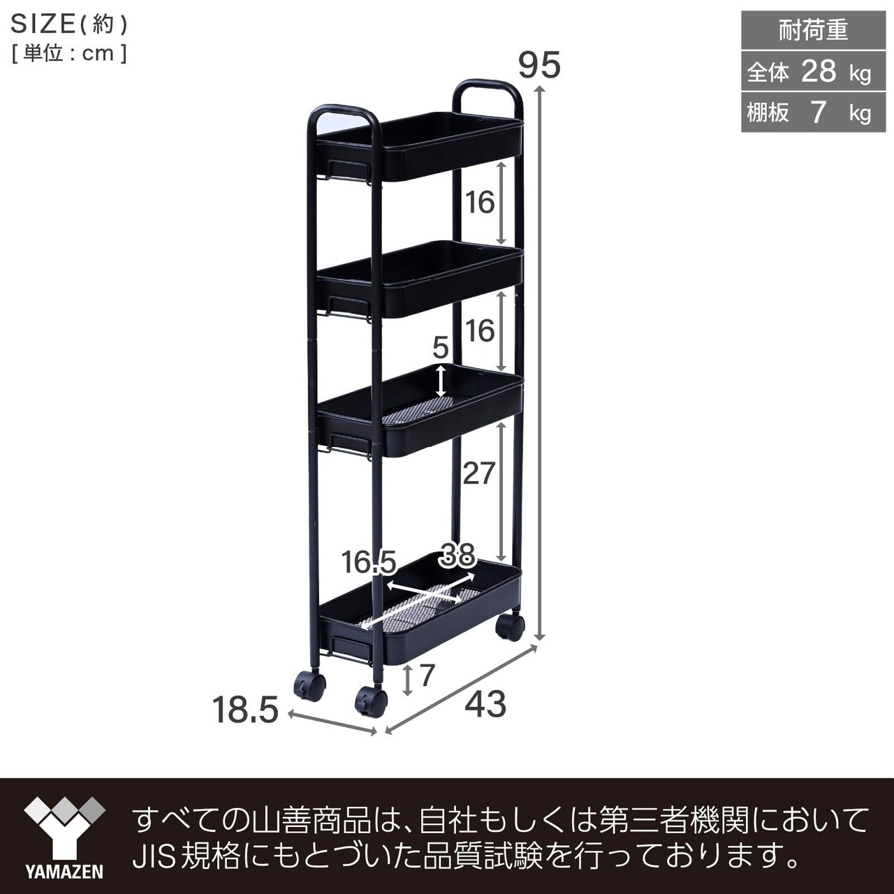 山善(YAMAZEN) キッチンワゴン キャスター付き 4段 スリム キッチン 収納 耐荷重28kg 幅43×奥行18.5×高さ95cm 隙間収納 ワゴン 組立かんたん マットブラック LBW-4FS(MBK)