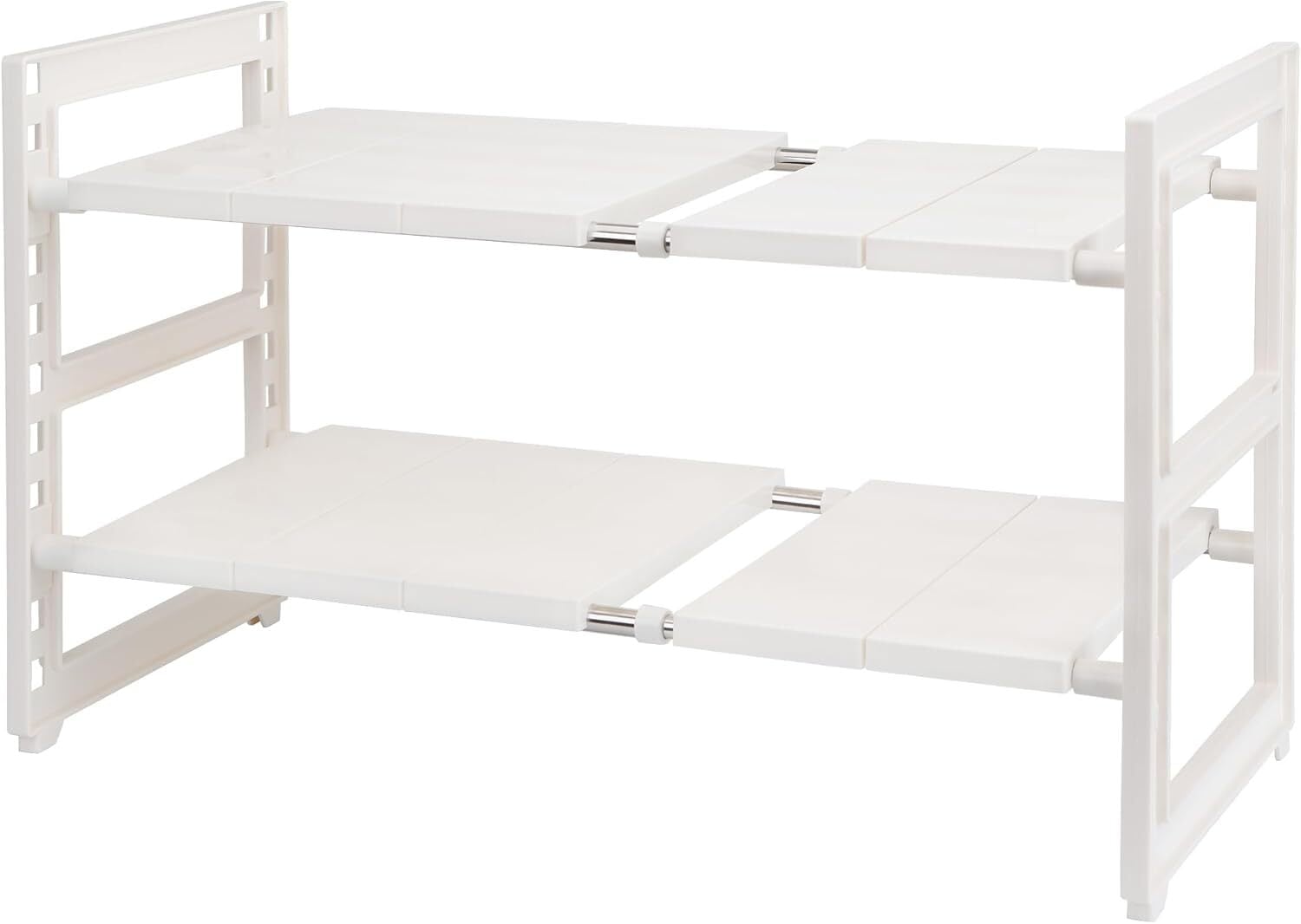 品名:TITIROBA シンク下収納ラック 伸縮式 2段(棚板10枚) 材質:棚板・フレーム:PP スライドパイプ:ステンレス鋼 サイズ:横56-70.5cm(無段階)×奥行27 cm ×高さ39.5cm(1.5cmピッチで10段階調節) ■■■【パッケージ内容】■■■
