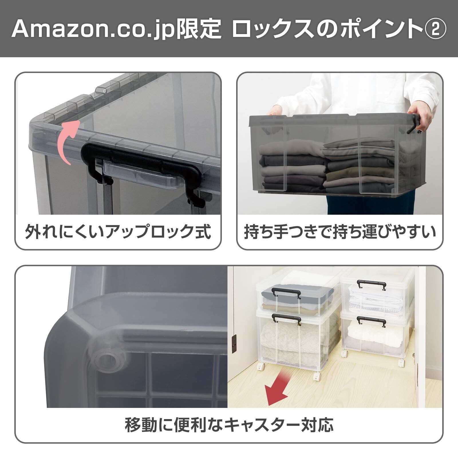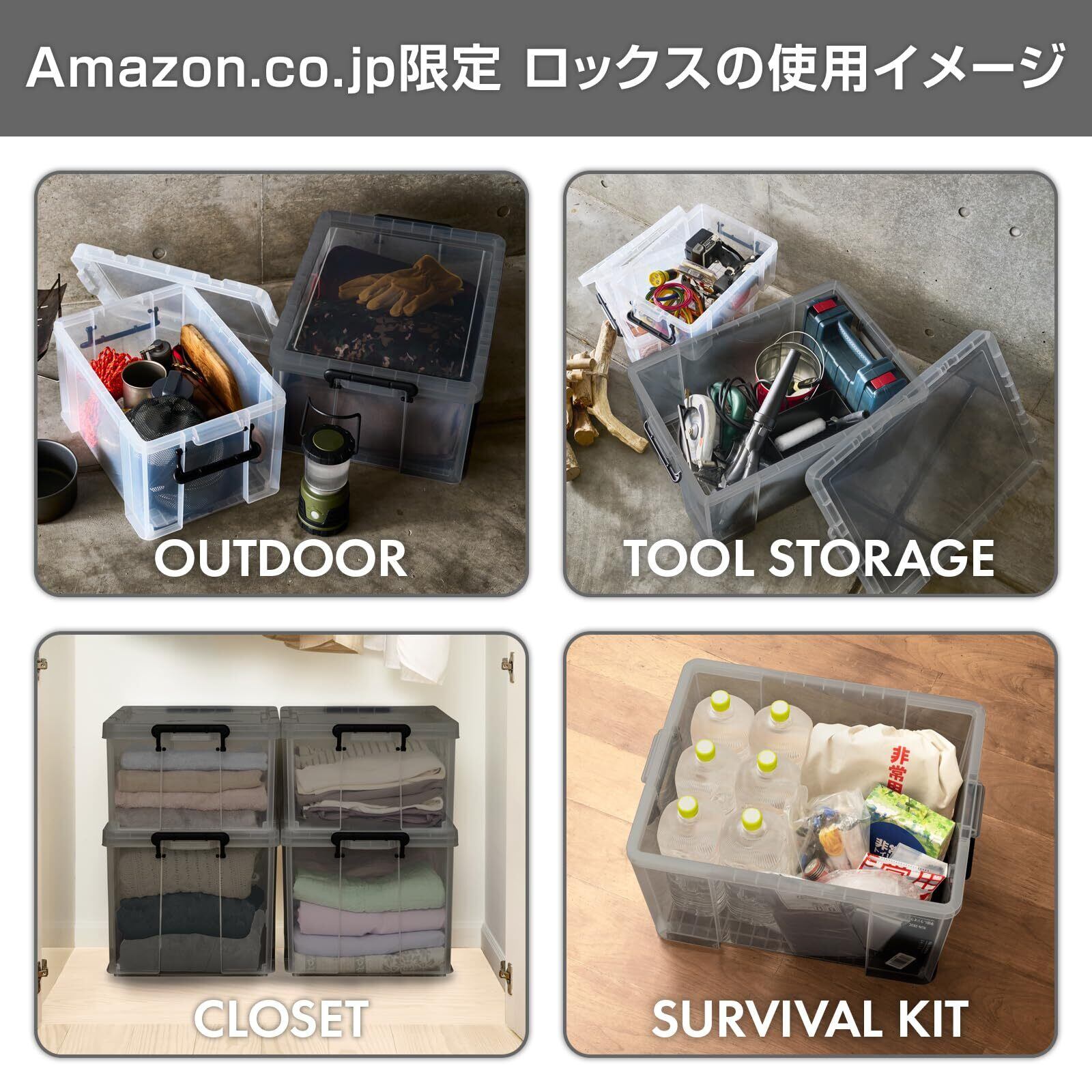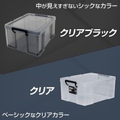 商品のロックス。クリアブラックなので収納物を程よく隠しつつ、何が入ってるかの確認はできるカラーでインテリアにも合います。服の収納だけでなくストックやアウトドア、工具を入れたりもおすすめです。従来のロックスとの積み重ねも可能で別売のキャスターにも対応しております。