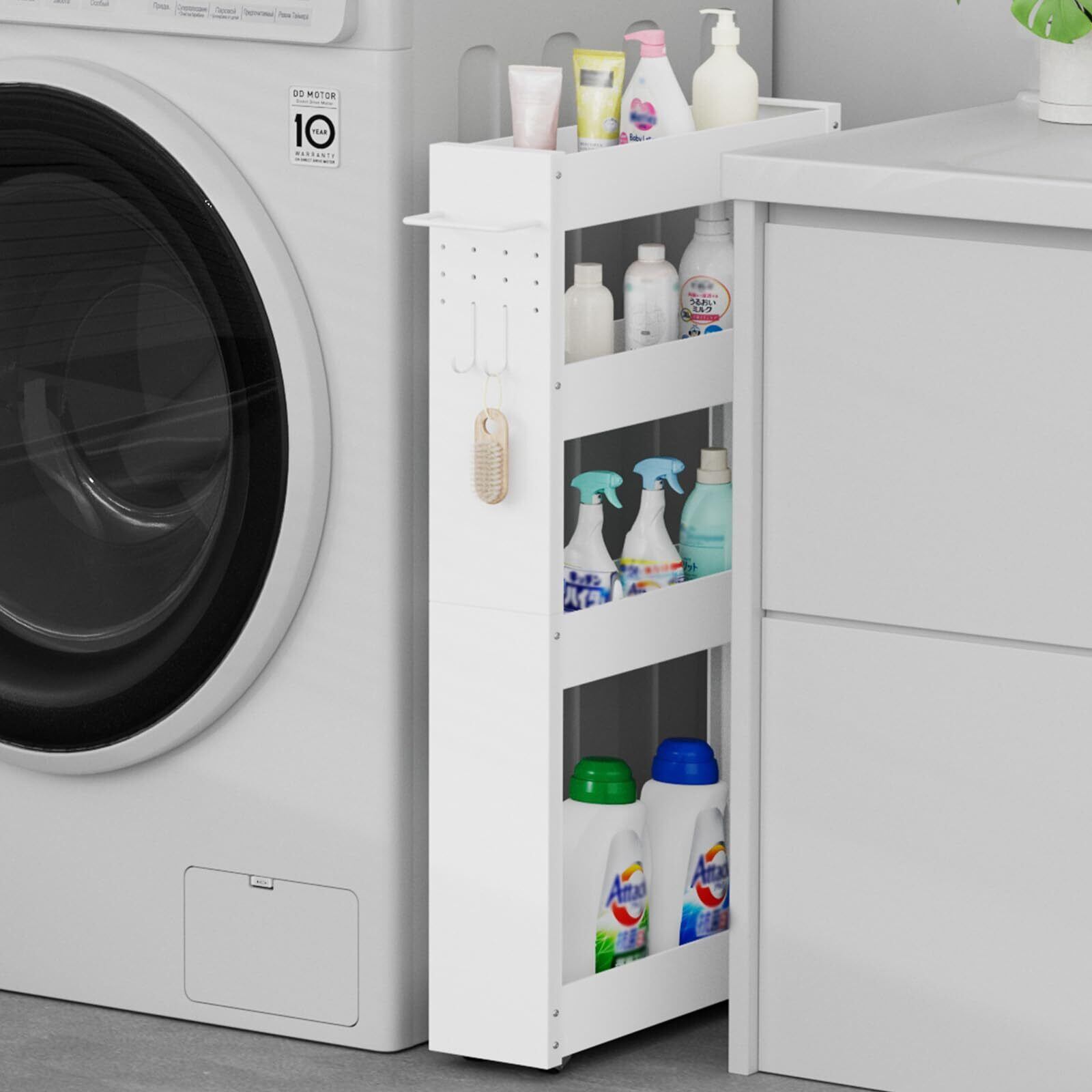 TKUIN すき間収納 ワゴン 幅13cm スリムトローリー キッチンラック 薄型4段 調味料 隙間ラック 冷蔵庫横 洗濯機横 洗面所 トイレ 小物 スチール 収納カート 耐荷重約32Kg ハンドル付き・隠しキャスター・フック2個 隙間収納ラック (ホワイト)