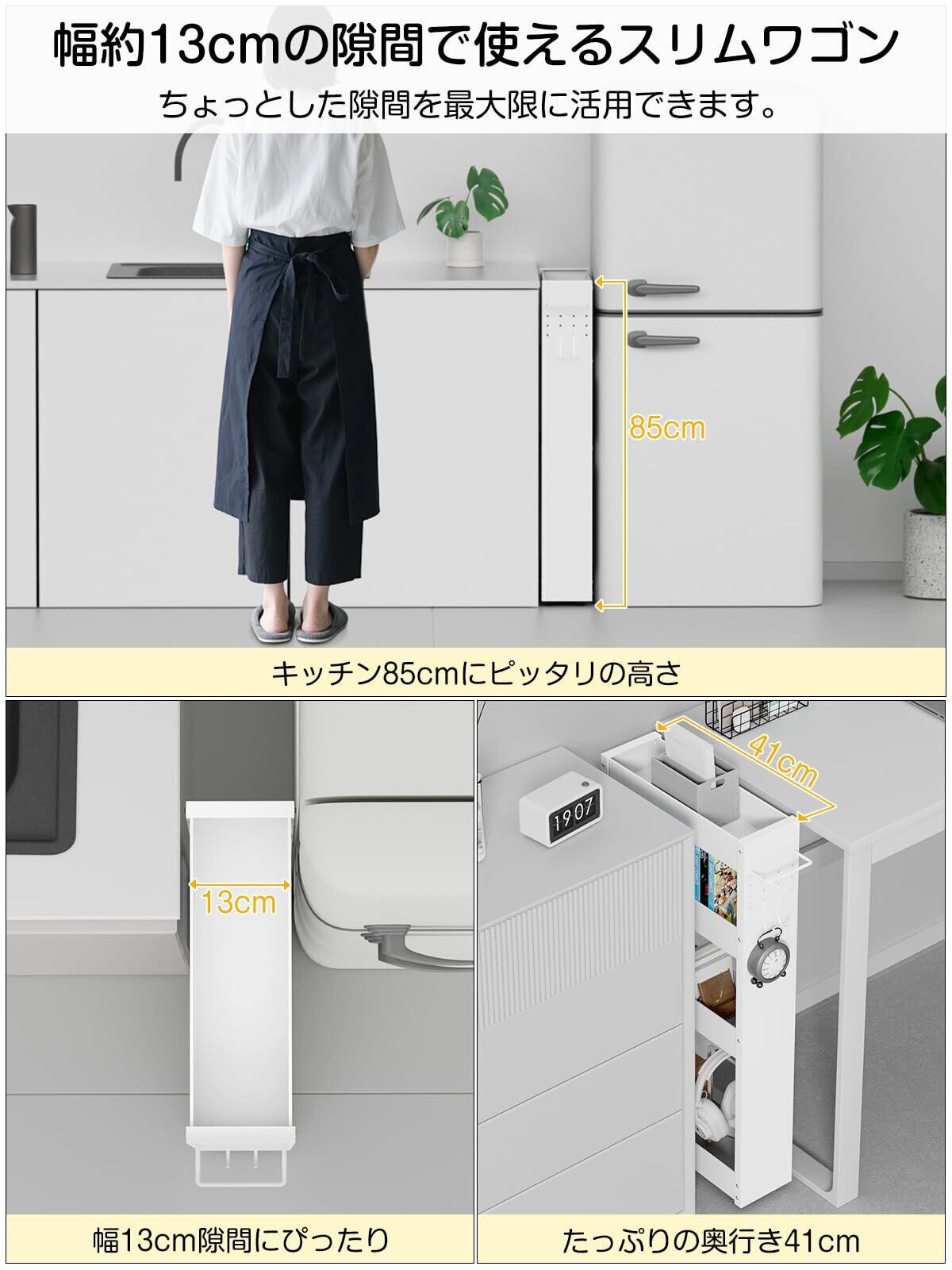 『TKUIN すき間収納 ワゴン』は、幅13cmのスリムなデザインで、冷蔵庫横や洗濯機横、トイレや洗面所などの限られたスペースにぴったりフィットします。薄型なのに4段式で、調味料や小物を効率的に整理整頓することが可能です。これにより、日常生活の質が向上することでしょう。