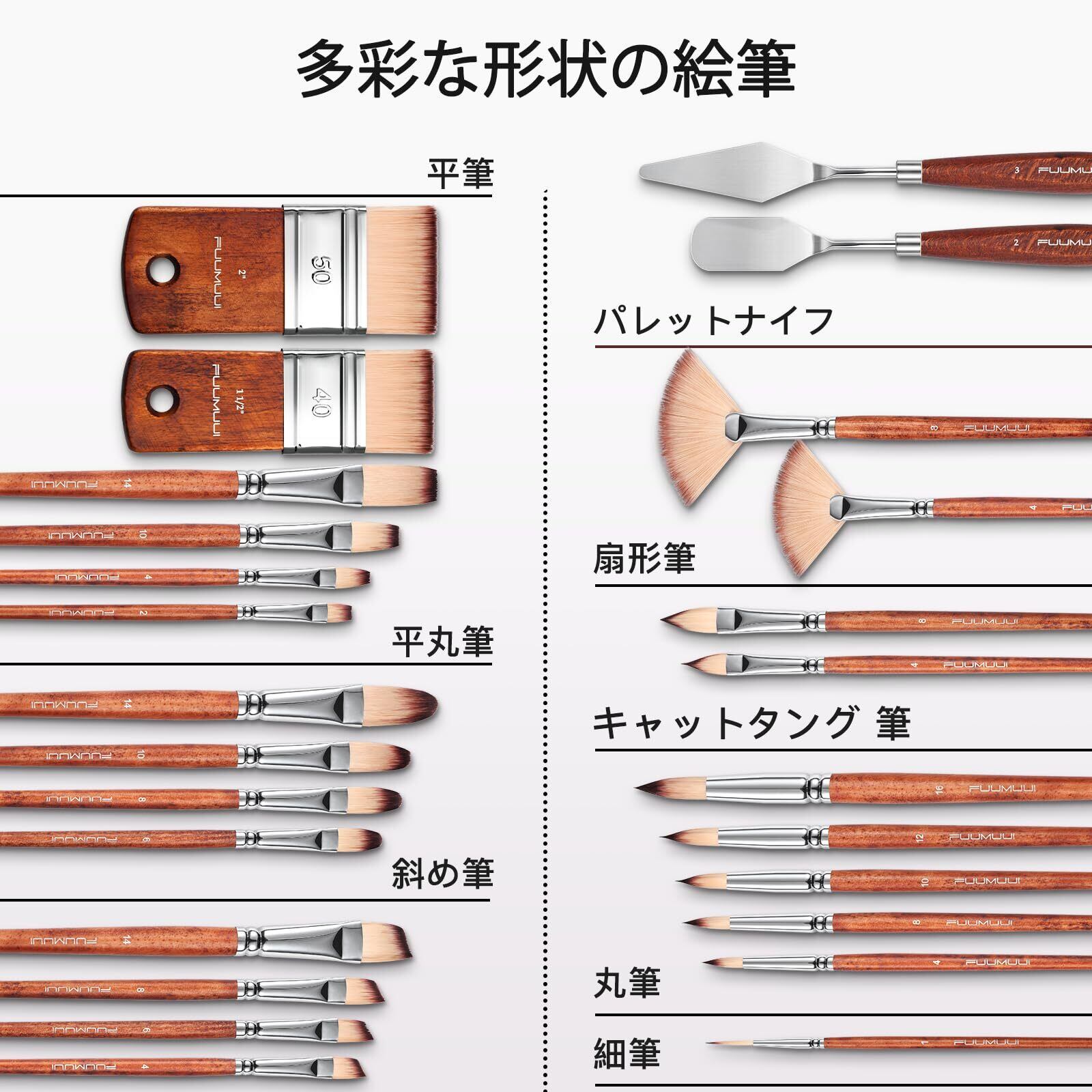 丸型、平型、平丸筆、扇型筆、斜め筆、細筆を含む多様な筆がセットになっており、様々なタッチやカラー表現を楽しむことができます。絵を描く際のニーズに応じた最適な筆を選ぶことで、あなたの表現がさらに豊かになります。