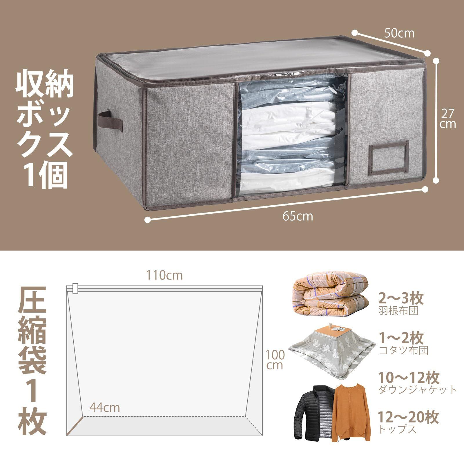 収納力に抜群:収納ボックス(1枚):65*50*27 cm ;圧縮袋(1枚):110*100*44 cm。収納目安:冬用掛け布団を2 ~ 3枚収納できます。圧縮袋と収納ケースが一体に,容量を減らすだけでなく、クローゼットの中に美しく収納することができます