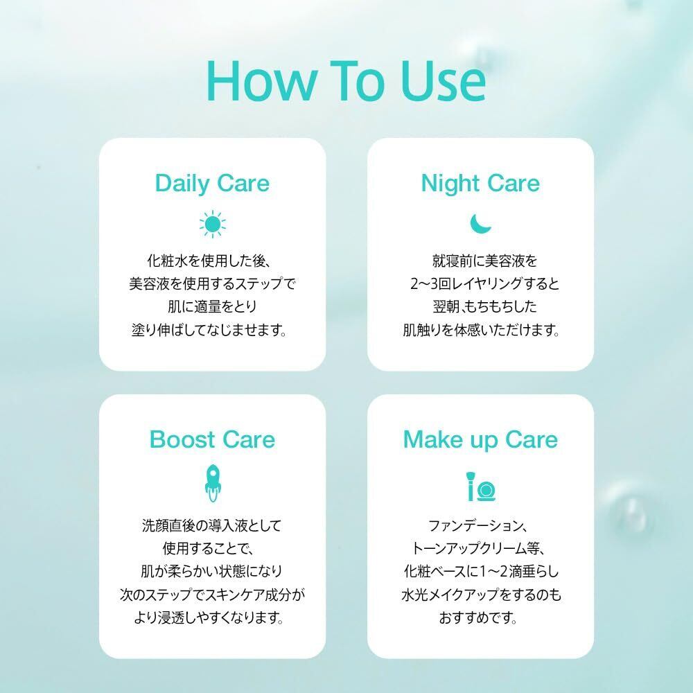 使用方法:化粧水を使用した後、美容液をしようするステップで肌に適量をとり塗り伸ばしてなじませます。