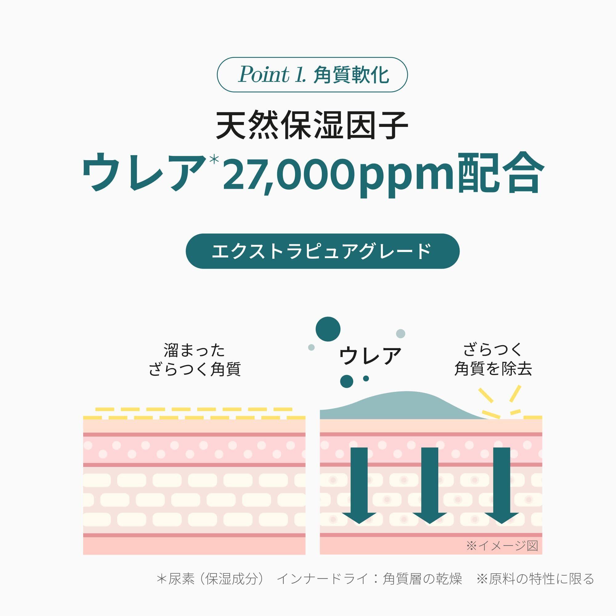 【6つの厳選美容成分で多角的な保湿ケア】 ウレアで角質をやわらげ、ペプチドで肌を整え、セラミドで潤いをキープ。さらにガーデニアカルス、フェルラ酸、パンテノールを配合し、乾燥によるごわつきやかさつきをケア。複数の保湿成分を一度に取り入れられる高機能設計