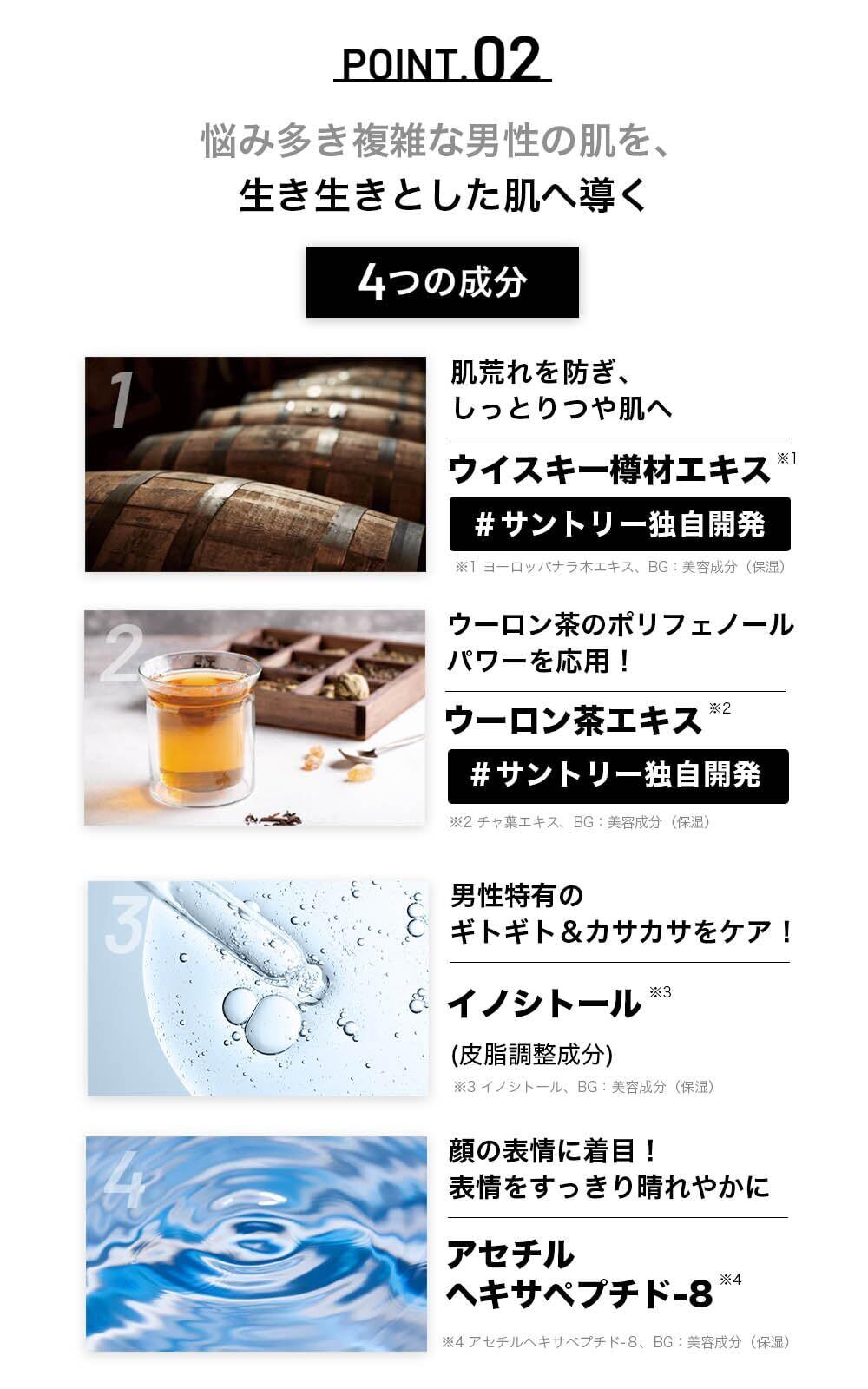 【おすすめする理由2:サントリーの独自開発を含む4つの成分を配合】肌荒れを防ぎ、しっとりつや肌へ導くウイスキー樽材エキス※1(サントリー独自開発)、男性特有のギトギト&カサカサをケアするイノシトール※2、肌にハリを与えるアセルヘキサペプチド-8※3、ウーロン茶のポリフェノールパワーを応用していきいきとフレッシュな印象へ導くウーロン茶エキス※4(サントリー独自開発)の4つのこだわりの成分を配合しました。※1 ヨーロッパナラ木エキス、BG:美容成分(保湿)※2 イノシトール、BG:美容成分(保湿)※3 アセチルヘキサペプチド-8、BG:美容成分(保湿)※4 チャ葉エキス、 BG:美容成分(保湿)