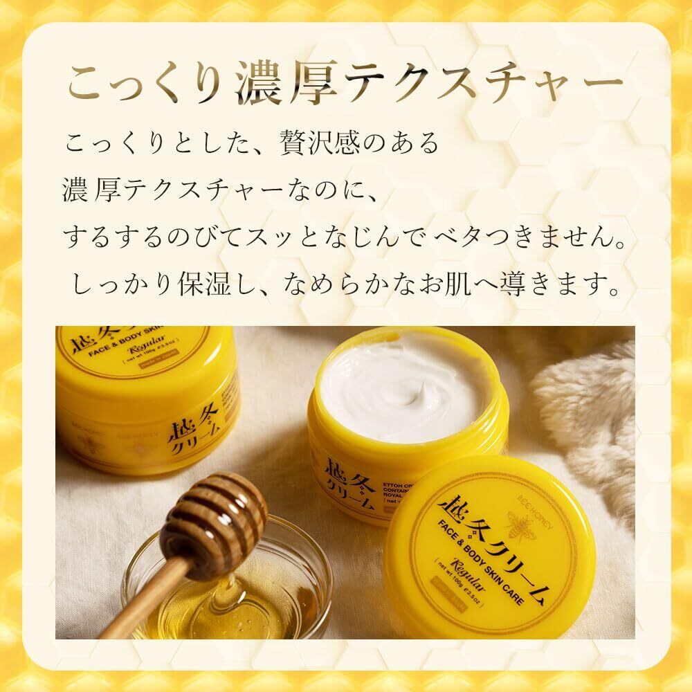 『BEE HONEY 越冬クリーム』は、全身用に設計されたボディクリームです。厳寒の季節でもしっかりと潤いを閉じ込め、肌を乾燥から守ります。優れた保湿成分を配合し、特に乾燥が気になる肌に潤いを与えることで、なめらかな肌へと導きます。