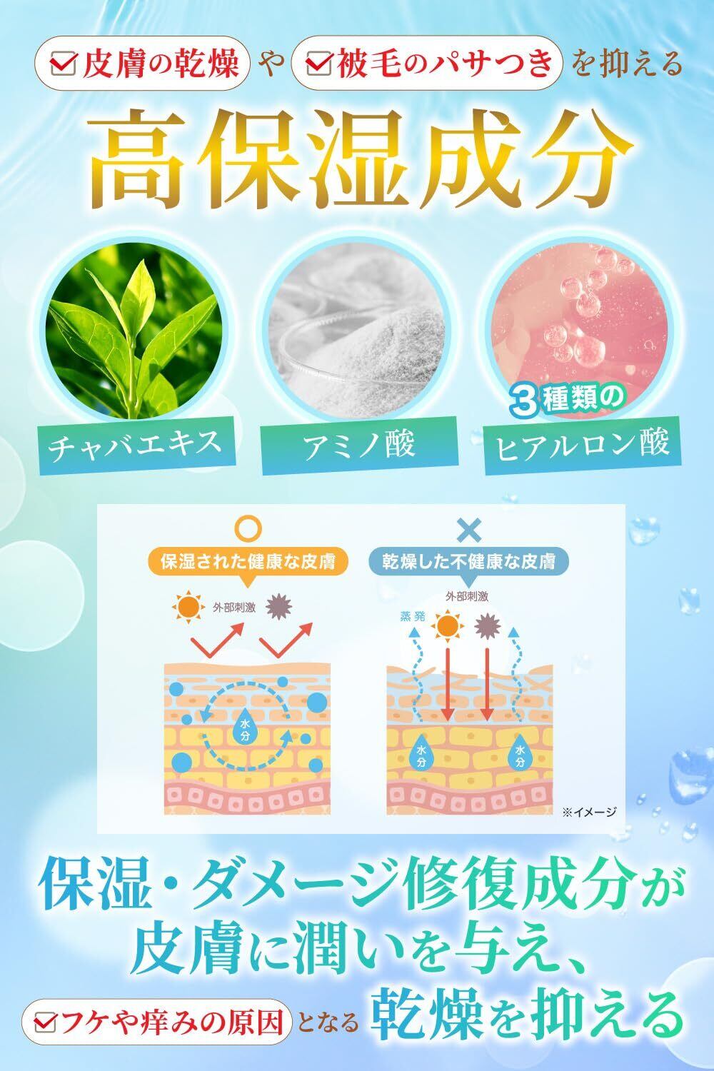 乾燥した季節や環境下でも、しっかりと潤いを与えることで、フケやカイカイの悩みを軽減します。このスキンケアミストを使うことで、愛犬や愛猫の皮膚をしっかりケアし、清潔感のあるつるつるの肌へ導きます。