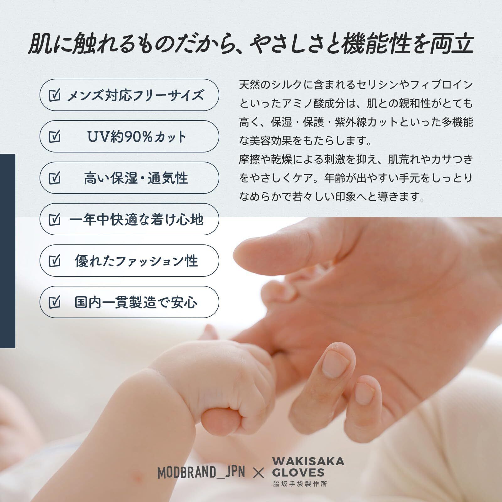 【シルク100%の上質素材】手元から差をつける、男の身だしなみは手元から。天然シルクを使用した柔らかな肌触り。通気性・吸湿性に優れ、長時間の着用でも蒸れにくく、快適で心地よい着け心地を実現しています。企画はMODBRAND、製造は奈良県の脇坂手袋製作所が担当。