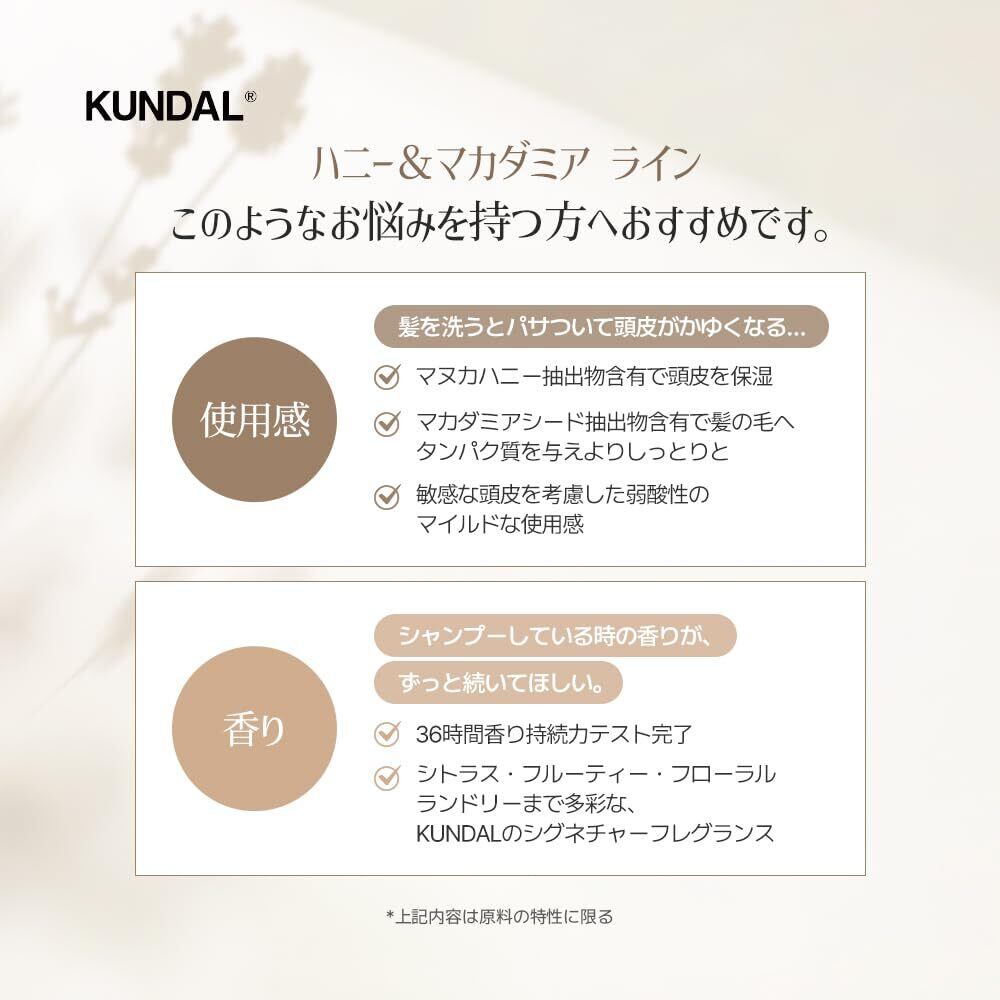 【ハニー&マカデミア】#弱酸性のクンダルヘアケアは、洗った後の頭皮の健康を考えた、マイルドな使用感が魅力です。#ハチミツエキスとマカデミアシードエキス配合で、頭皮に潤いを与え乾燥から守ります。