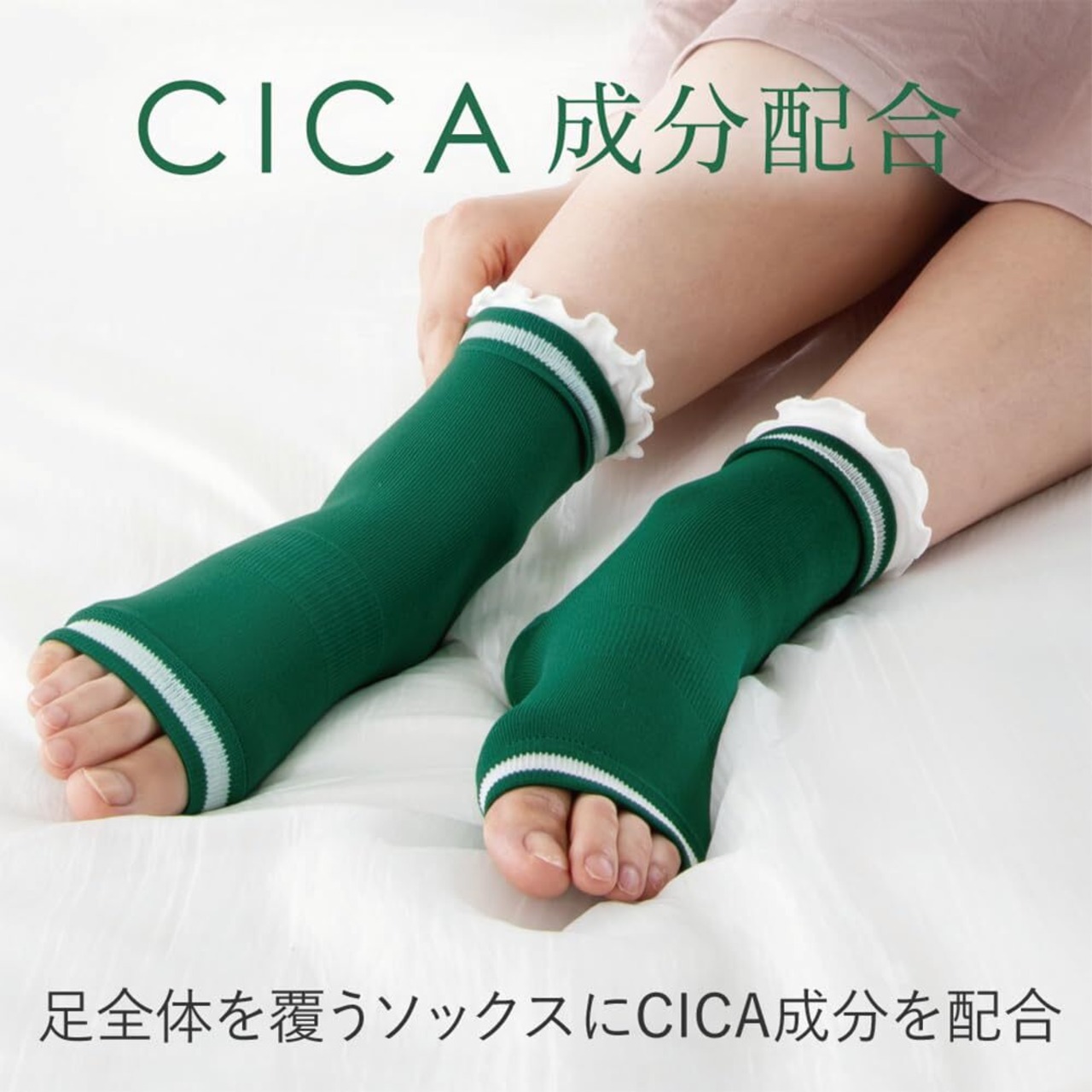 オープントゥーで足先ムレない:足先カットにより足先ムレずにかかとを集中保湿。CICA成分配合生地もあわさって就寝中のケアに最適です。