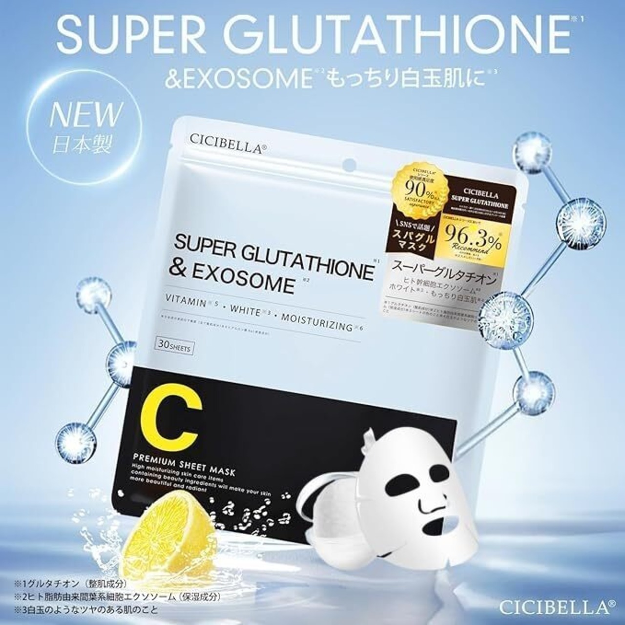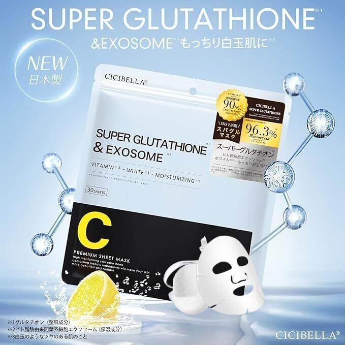 美白マスク スーパーグルタチオンとエクソソームマスク 30枚入り 日本製 ビタミンC、レチノール、ナイアシンアミド、ヒト幹細胞成分配合 高保湿 美白 敏感肌と乾燥肌向け