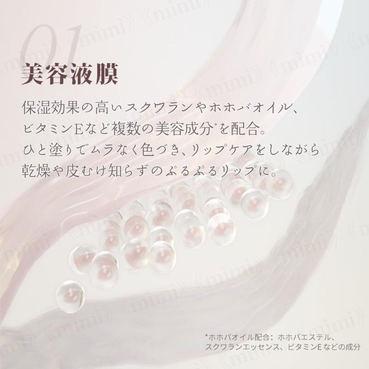 このリップは、特殊なカラーロック膜によって、鮮やかな色合いを長時間キープします。日常生活の中で、飲食を楽しんでも、色あせを気にする必要がありません。潤いを与えながら、美しさをしっかりとサポートします。