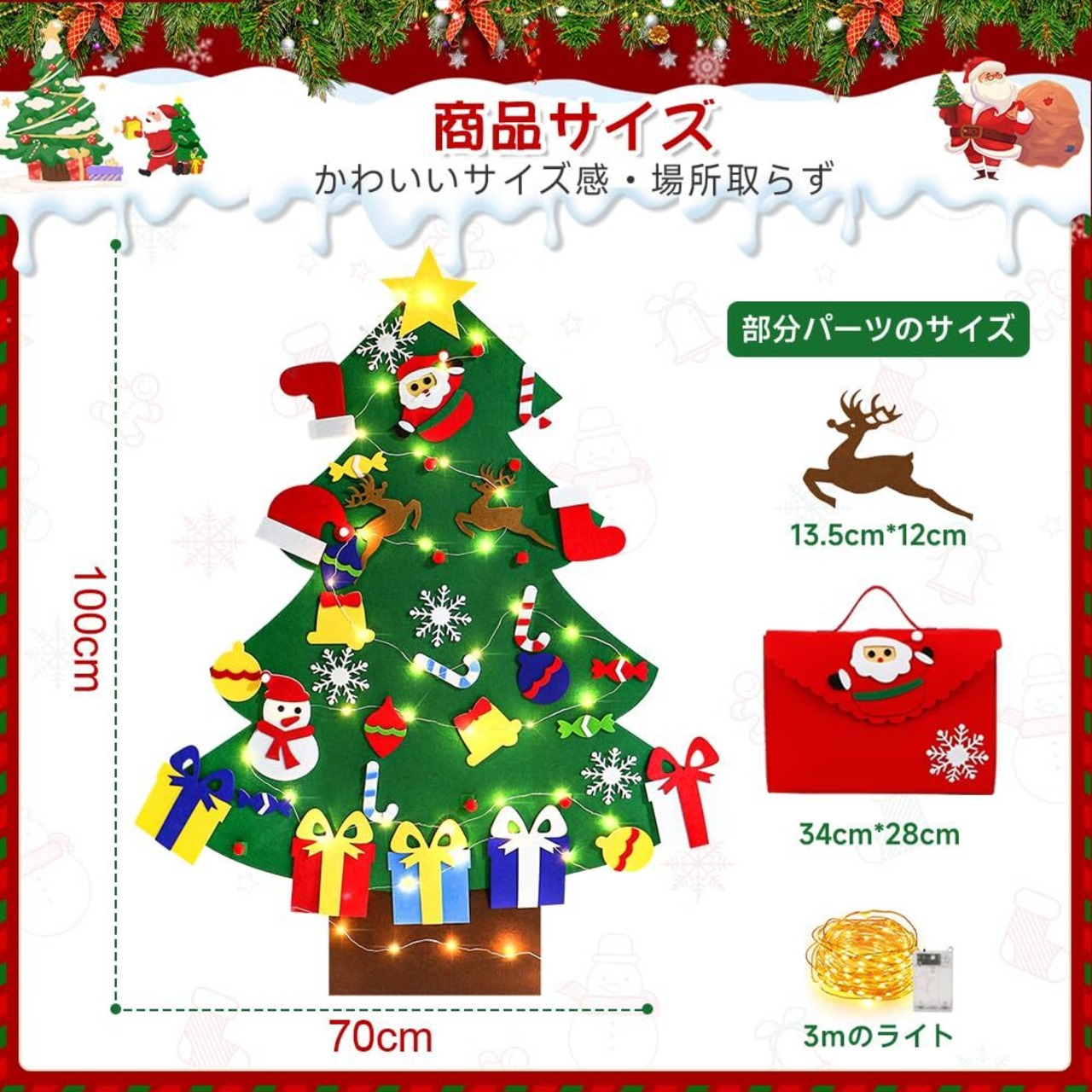 このツリーは、フェルト素材で作られており、手作りの温もりがあります。LED電飾付きなので、夜になると煌びやかなイルミネーションでお部屋を魅了します。お子様と一緒に飾り付けを楽しむことで、家族の絆を深める素敵な時間を提供します!