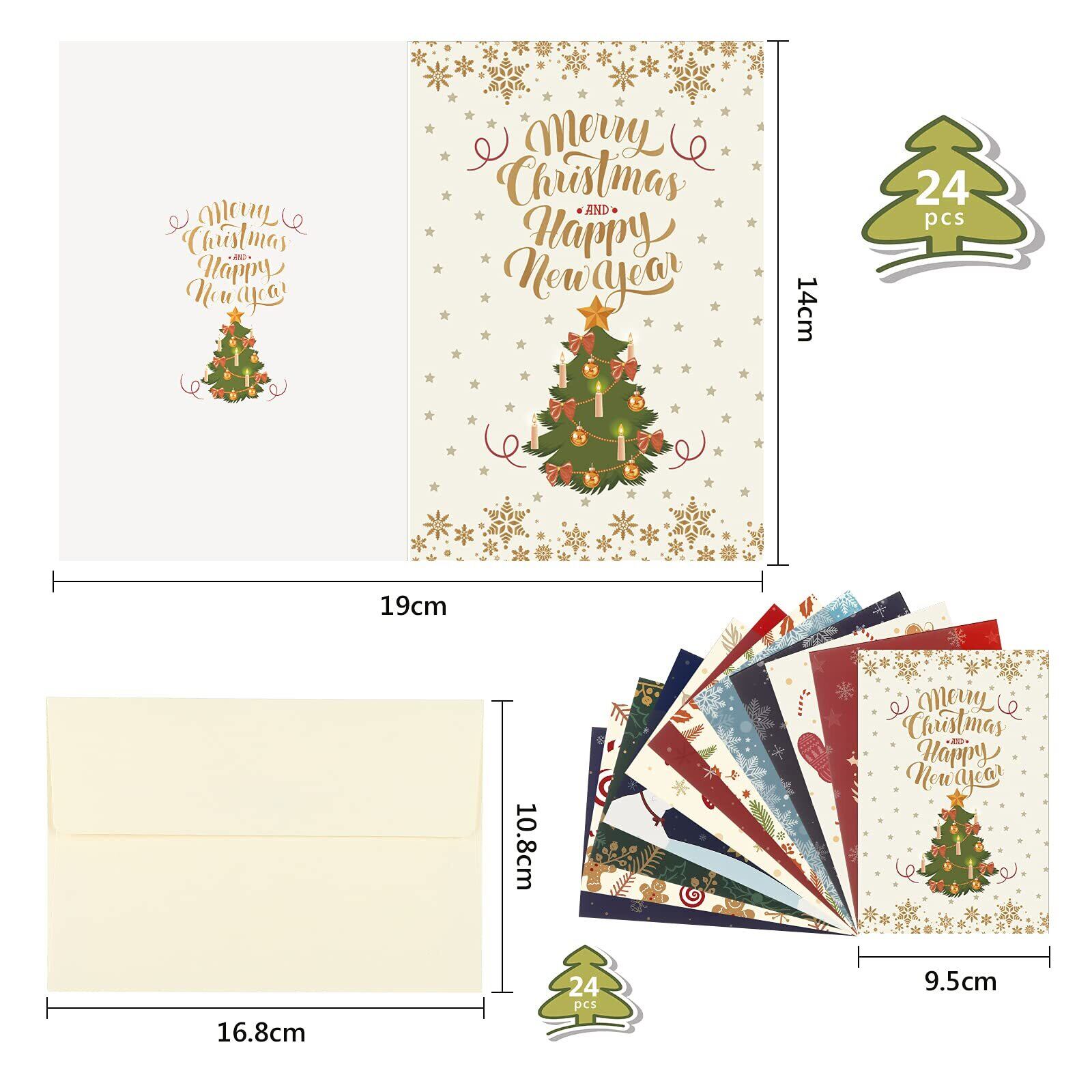 【たっぷり24枚セット】入数:24枚クリスマスカード(12種、各種2枚入り)& 24枚封筒(水糊付き)、サイズ:9.5x14cm(2つ折)、素材:250g/m²上質紙(厚手)