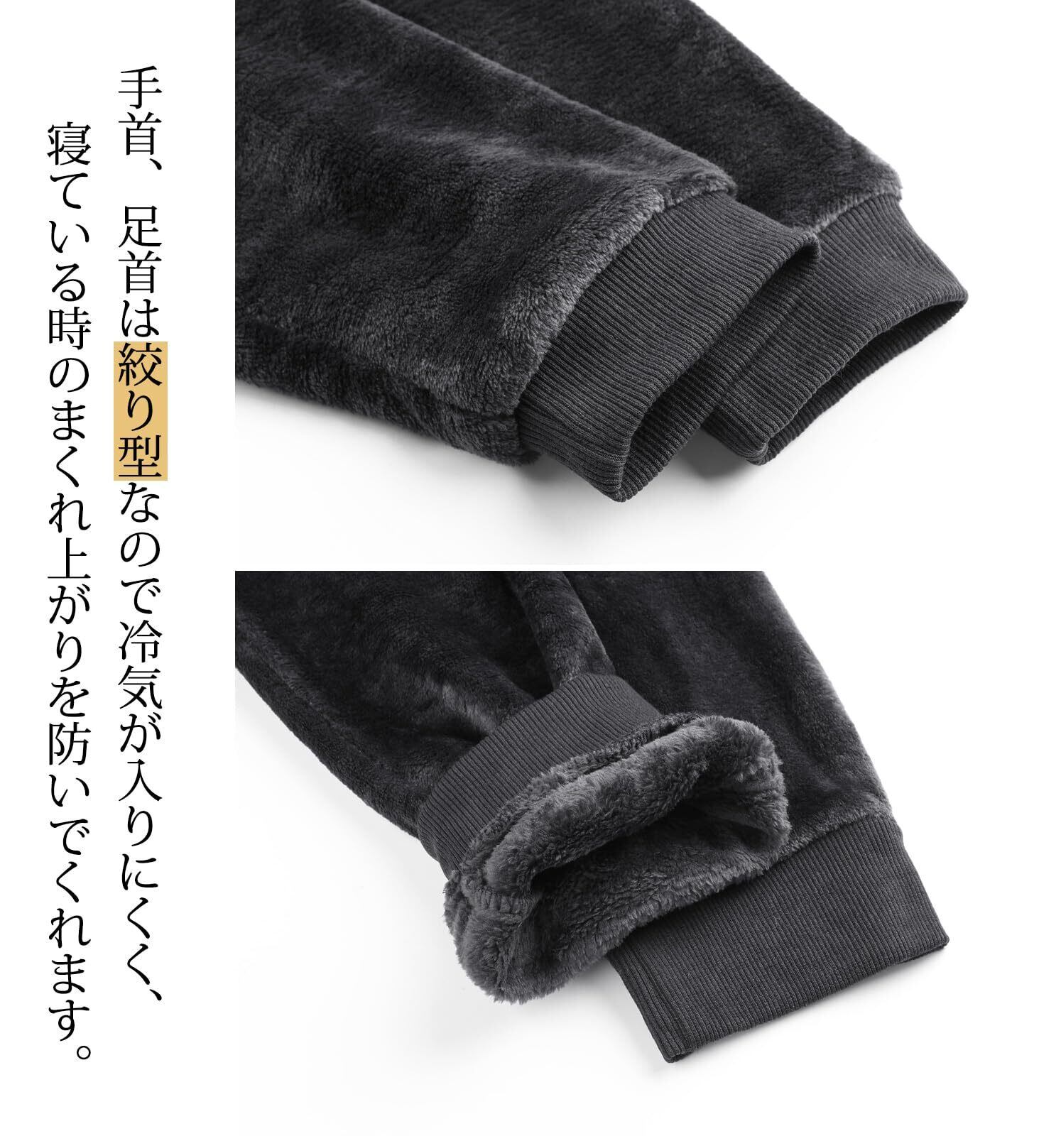 【デザイン】裏側が全て起毛でポカポカ!手首、足首は寒さを防ぐリブ仕様。裾口、袖口から冷たい空気が入り込みにくいので冷えません。就寝時などにずり上がりにくく、あたたかさをキープできます。ウエストはゴム仕様なのでよく伸びるので快適です。