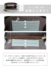とっても機能的なお財布ポシェット。 理想の使いやすさをすべて実現 フロント部分のがま口ポケットはスマートフォンを入れることができ、 ポシェットひとつでお出かけ可能です。カードポケットは6つ。 小銭入れは落下防止にファスナーを。 フリーポケットは両側に、広めに作られているので 紙幣を種類別に分けたり、領収書やレシートも収納可能。