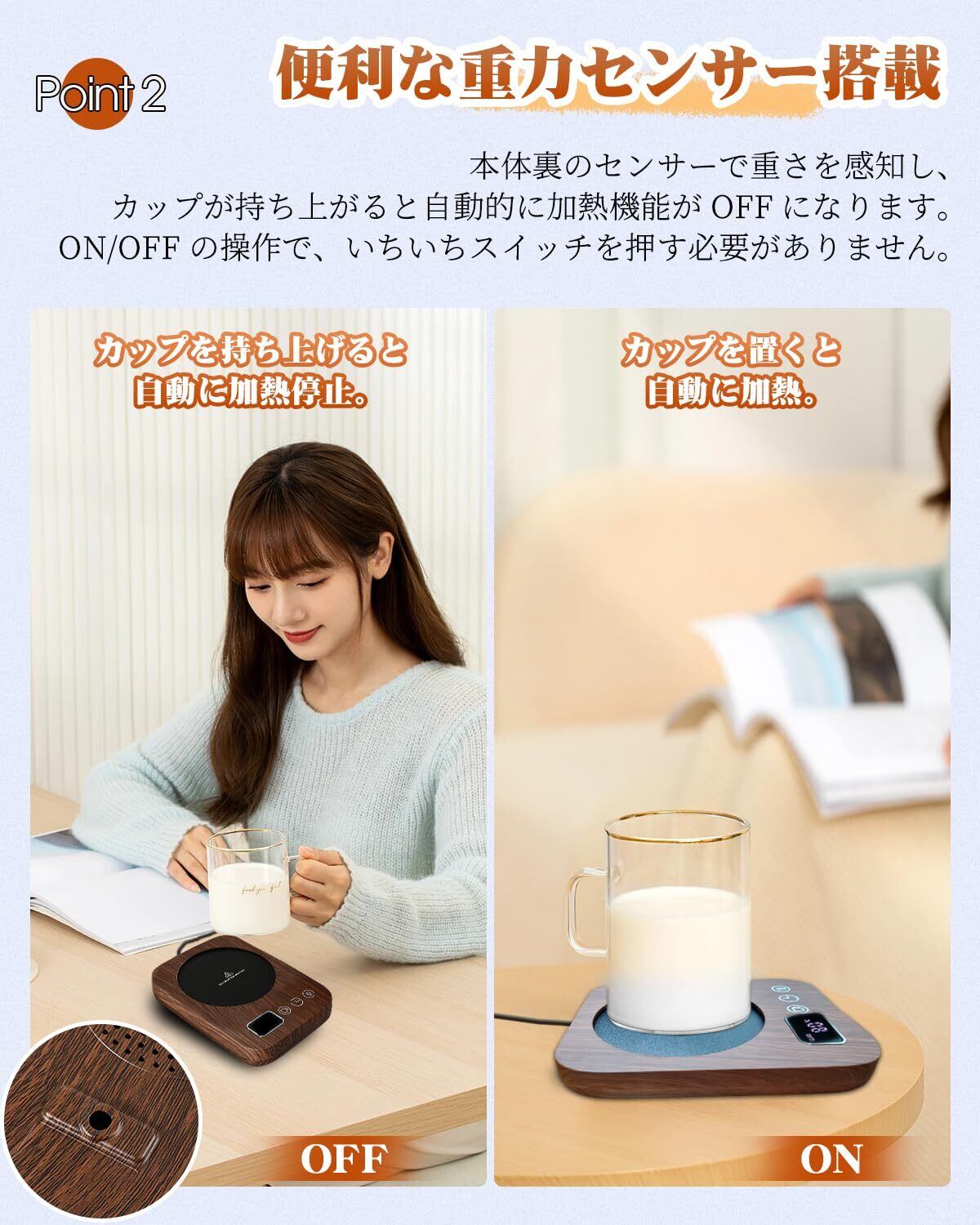このカップウォーマーは、重力センサーによりカップを置くと自動的に温めが開始されます。シンプルな操作で、飲むたびに温かさを実感でき、毎日の生活にプラスの快適さをもたらします。タイマー機能も搭載しており、2時間から12時間の間で設定が可能です。