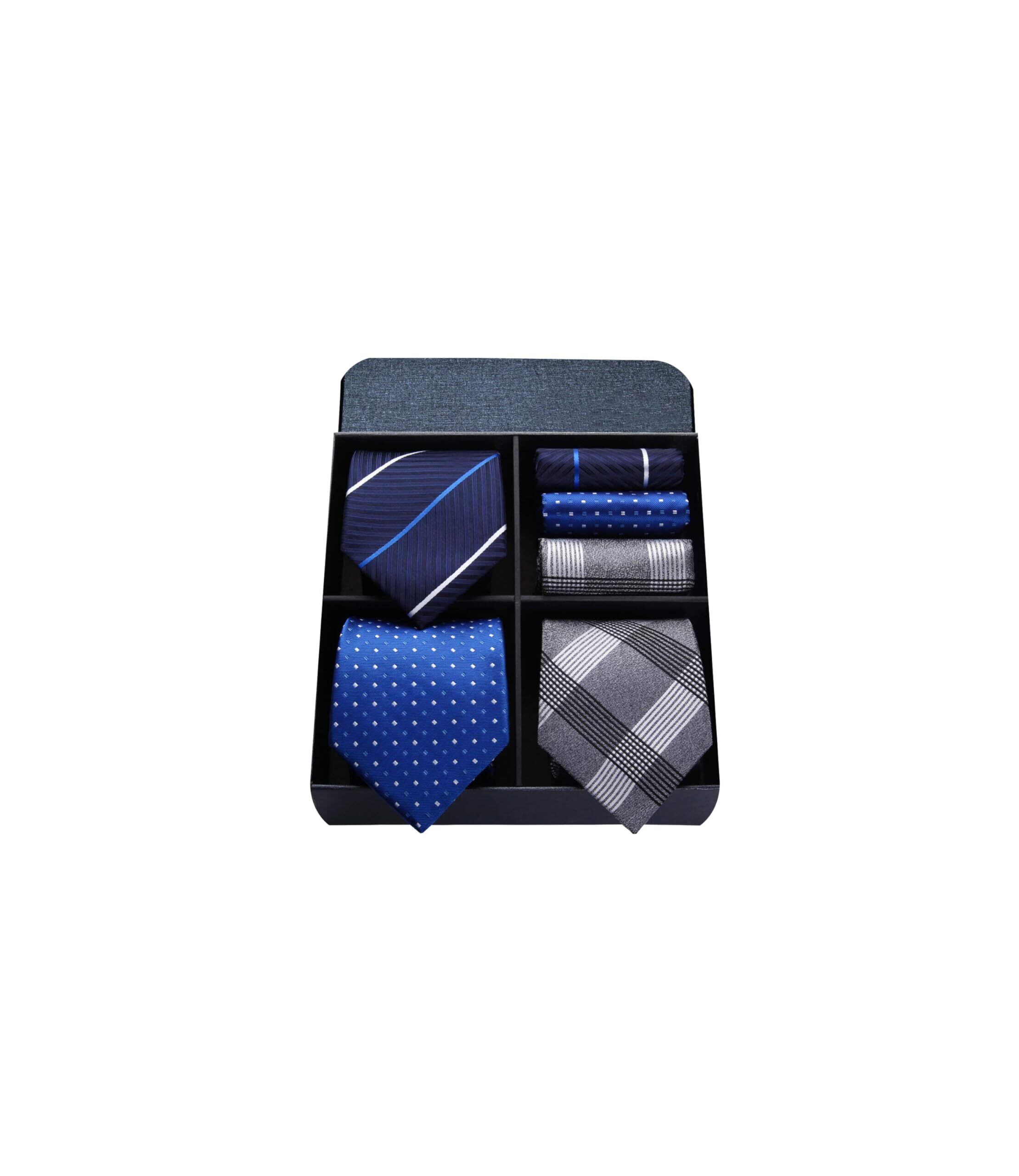 【 セット内容 】ネクタイ 3本 +ポケットチーフ 3本、HISDERNブランド専用ボックスが付きます。 商品サイズ:ネクタイ 幅8.5cm / 長さ150cm | ポケットチーフ: 31cm*31cm。