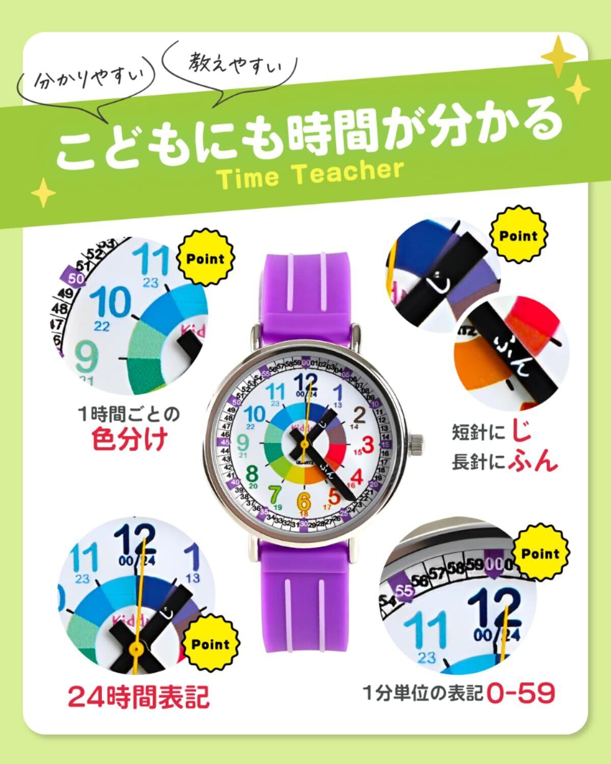 この腕時計は、ただのアイテムではなく、時間を学ぶための知育ツールでもあります。アナログ表示が子供たちの理解を助け、時計の読み方や時間の感覚を自然に身につけさせます。遊び心満載のデザインで、お子様の学びを楽しくサポートします!