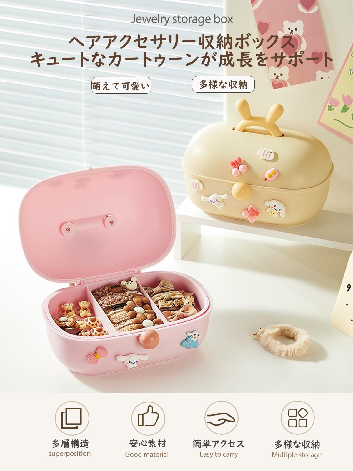 大きな収納ケースには、ヘアアクセサリーをたっぷり収納できる仕様になっています。お子様が自分で選んで取り出せるので、おしゃれを楽しむ気持ちを育むお手伝いをします。持ち運びにも便利なデザインで、お出かけ時にも活躍します。