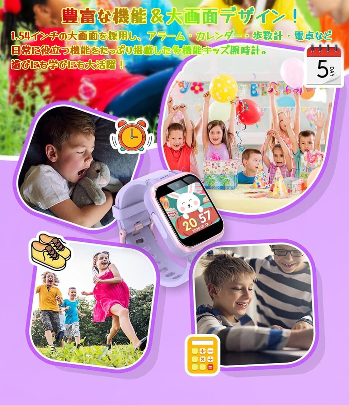 【1.54インチIPSカラースクリーン】240×240高解像度のIPSタッチスクリーンを採用。小学生や低学年のお子様でも簡単にスムーズ操作が可能。時計としてはもちろん、写真・動画撮影、録音、ゲーム機能、歩数計、電卓まで搭載した多機能 子供用腕時計。かわいいデザインで男女兼用、お子様の学習意欲や探求心を育てる知育スマートウォッチ。