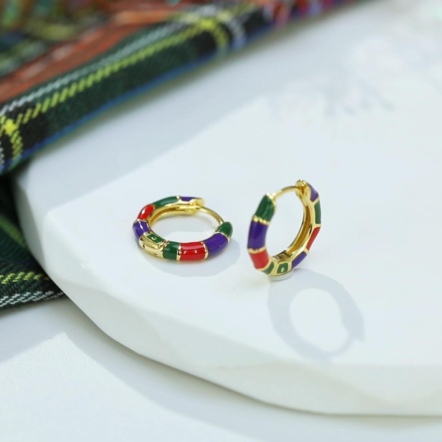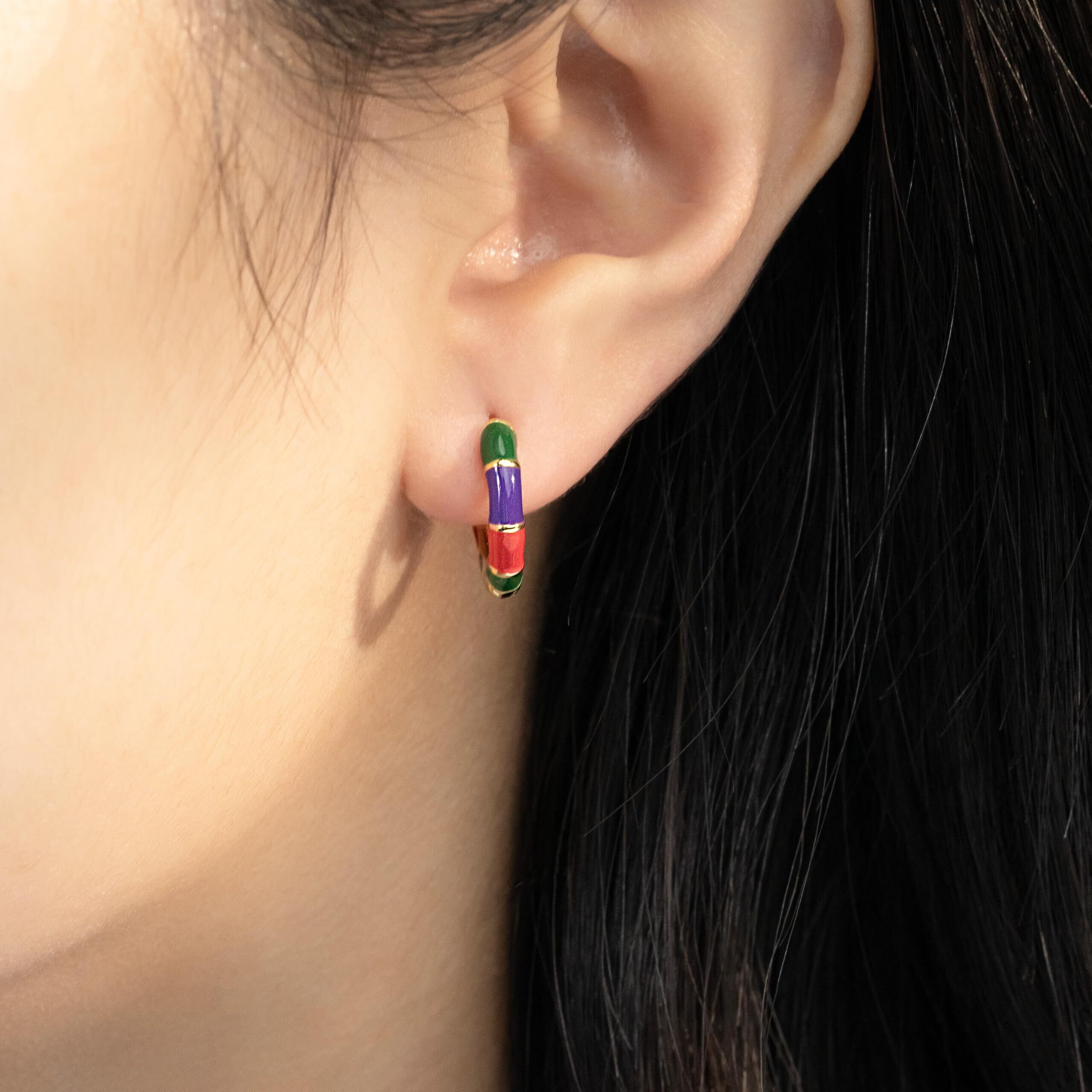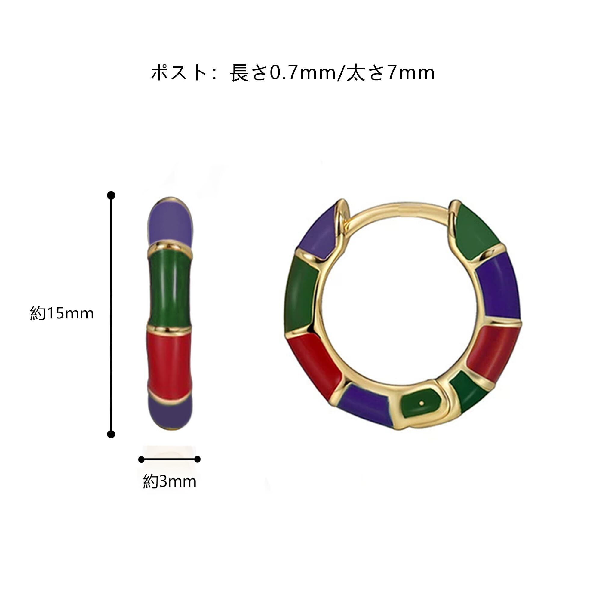 個性的: こちらのゴールドベースのフープピアスは、定番の単色を超え、深紅、エメラルドグリーン、ミステリアスなパープルが織りなす個性的な魅力が特徴です。中折れ式の確かな留め具は、装着の容易さと安心感を実現