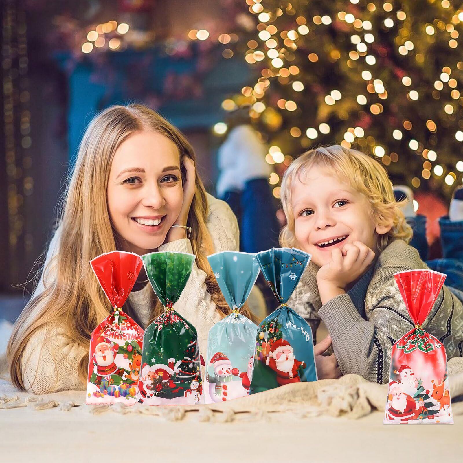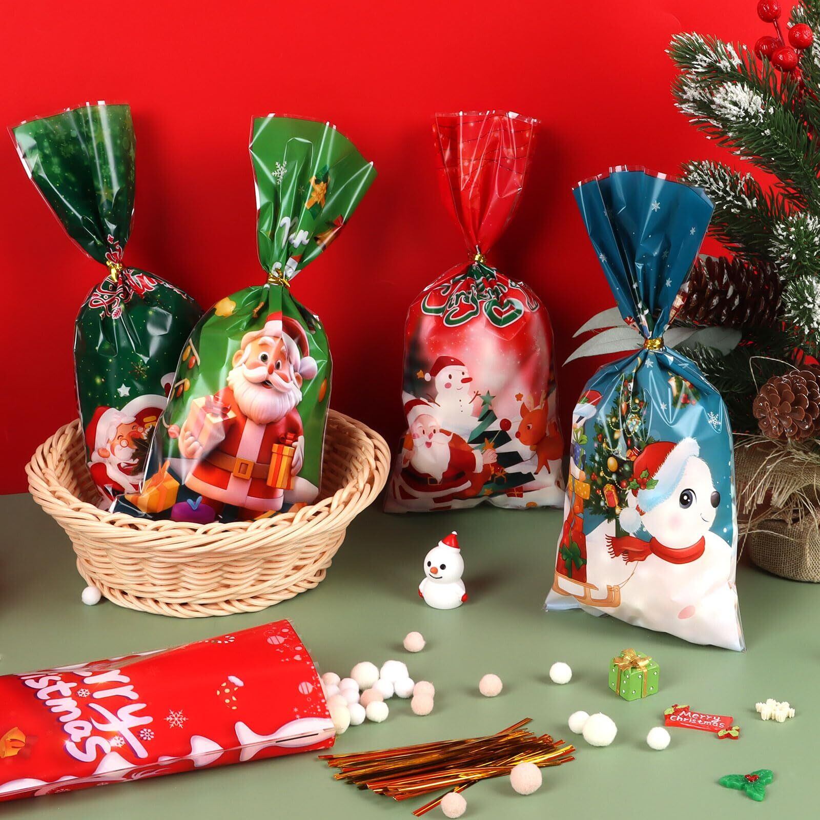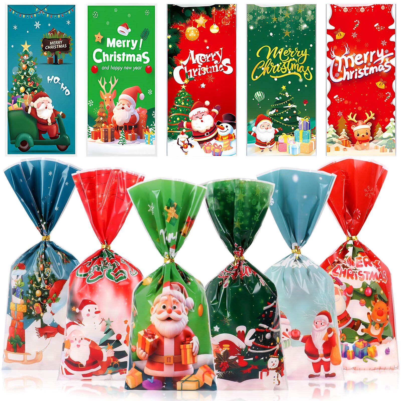 ◆[FINGOOO クリスマス袋 ラッピング 100枚入・11柄 ギフトバッグ 透明 包装 入れ物 小分け袋 大量 景品 プレゼント らっぴんぐ 雑貨 プレゼント 贈り物 リボン付き (クリスマスB)]◆