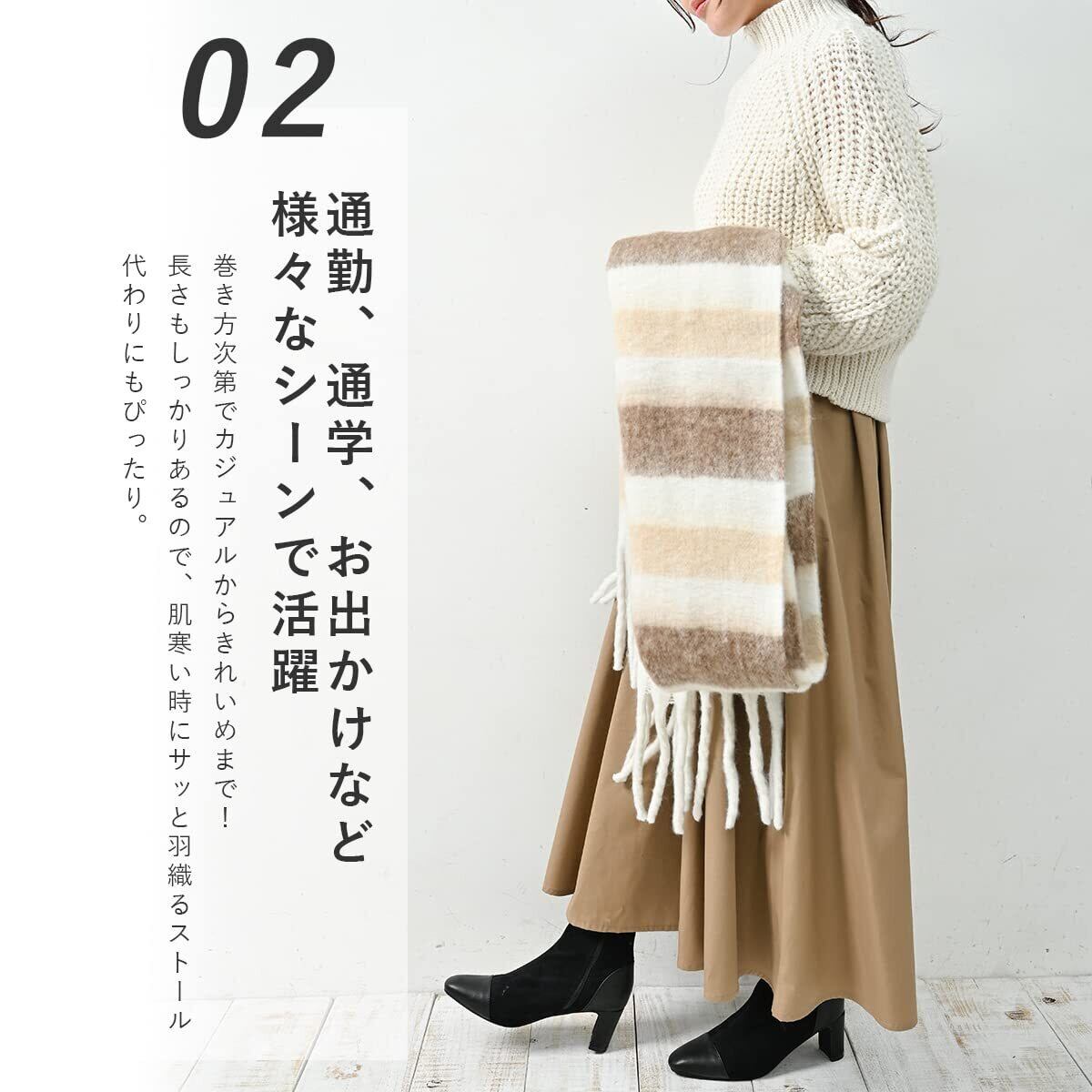 寒い季節の防寒対策に欲しいアイテム。ボリュームのある生地と長いフリンジで、巻き方次第でカジュアルからきれいめまで!