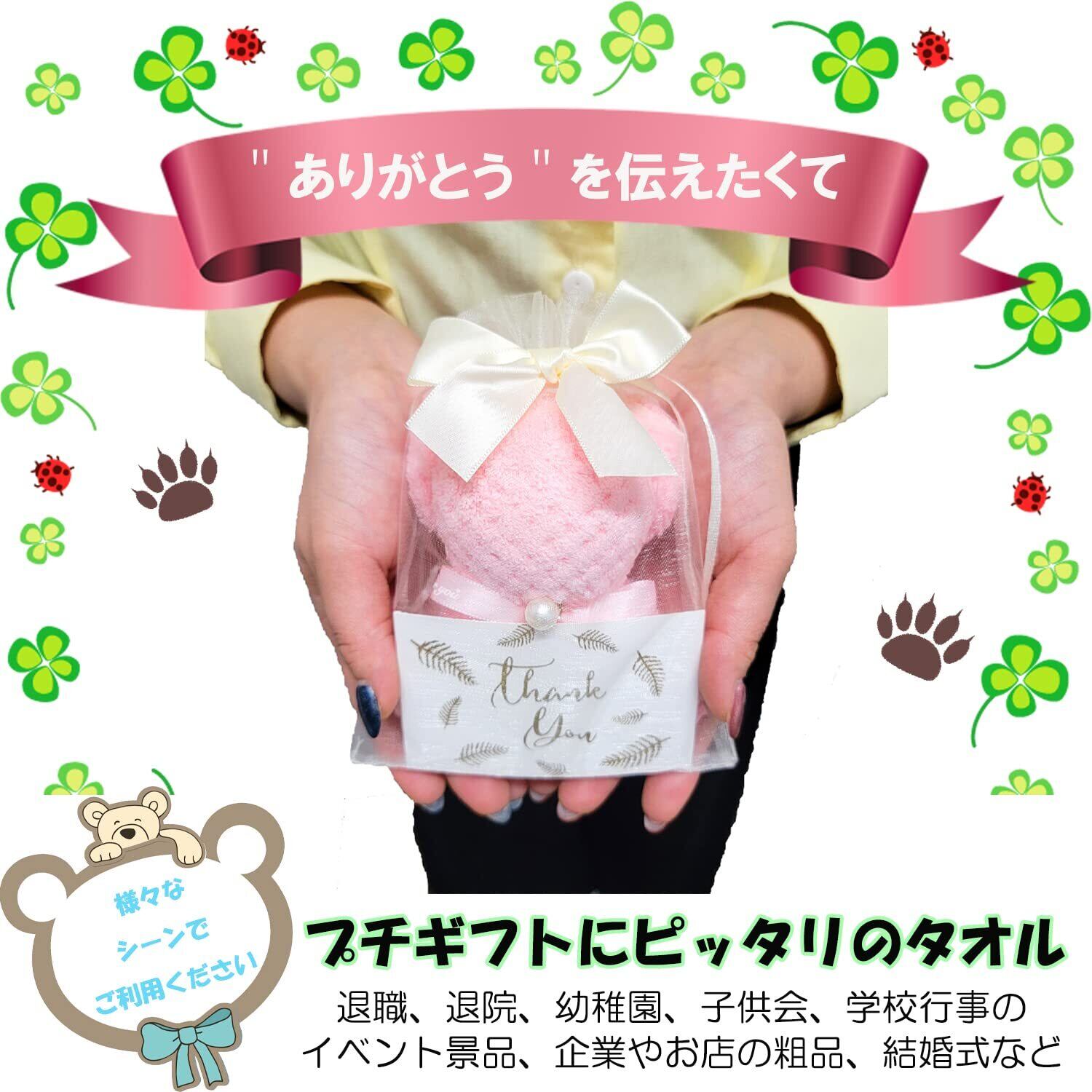 【さまざまな用途のプチギフトとして】退職、異動、引っ越しの挨拶・誕生日、ホワイトデー、内祝い、結婚式などのお返し・子供会、幼稚園、学校行事のイベントの景品・企業やお店の粗品として最適です。 【プチサイズ】タオルハンカチで作ったとってもかわいいタオルベア、プチサイズで尚且つ実用的なので贈る側もお手軽に、受け取る側も嬉しい。 【特別感】タオルベア5色、ギフト袋5色、メッセージカード5パターンとバリエーション豊富で100パターン以上の組み合わせが可能です。 お渡しする1人ひとりに特別感を演出出来ます。