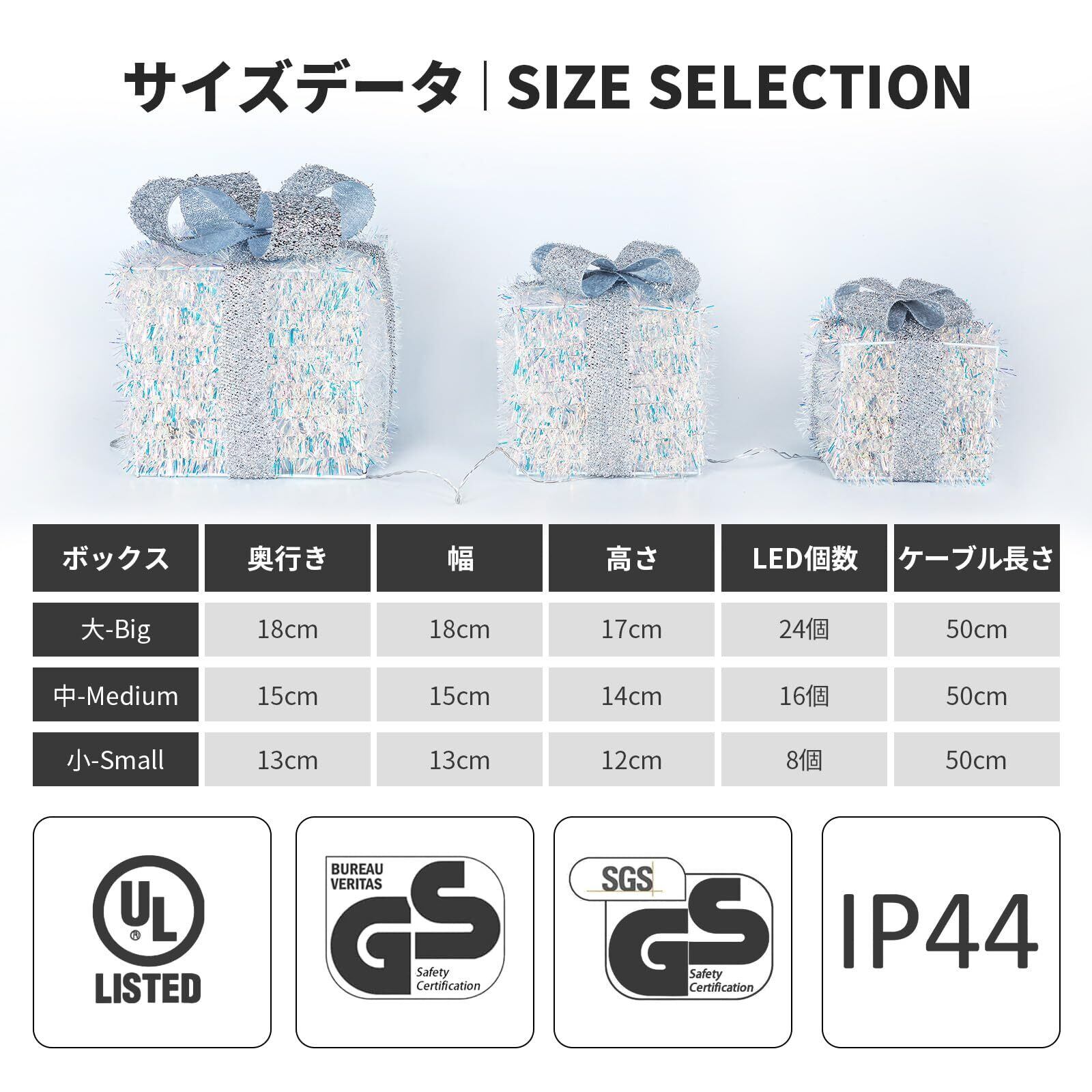 素材:Sisal and Metal サイズ:(大)18cm x 18cm x 17cm /(中)15cm x 15cm x 14cm / (小)13cm x 13cm x 12cm LED数:(大)24個 /(中)16個/ (小)8個 クリスマス装飾のニーズを満たす十分な量が含まれています。