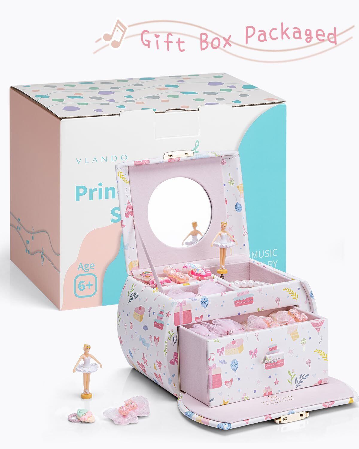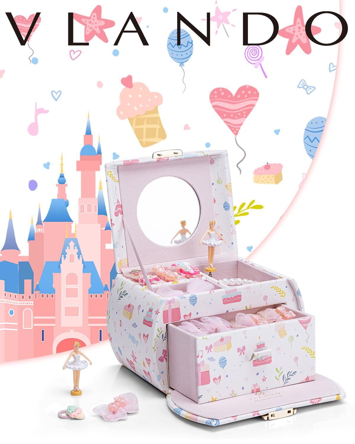 [Vlando, ジュエリーボックス, 娘へのプレゼント, 半円形, 鏡付き, オルゴール, プレゼント, 子供, アクセサリーケース, 携帯用, 引き出し, 2段, 女の子, 人気, 七五三, プリンセス]