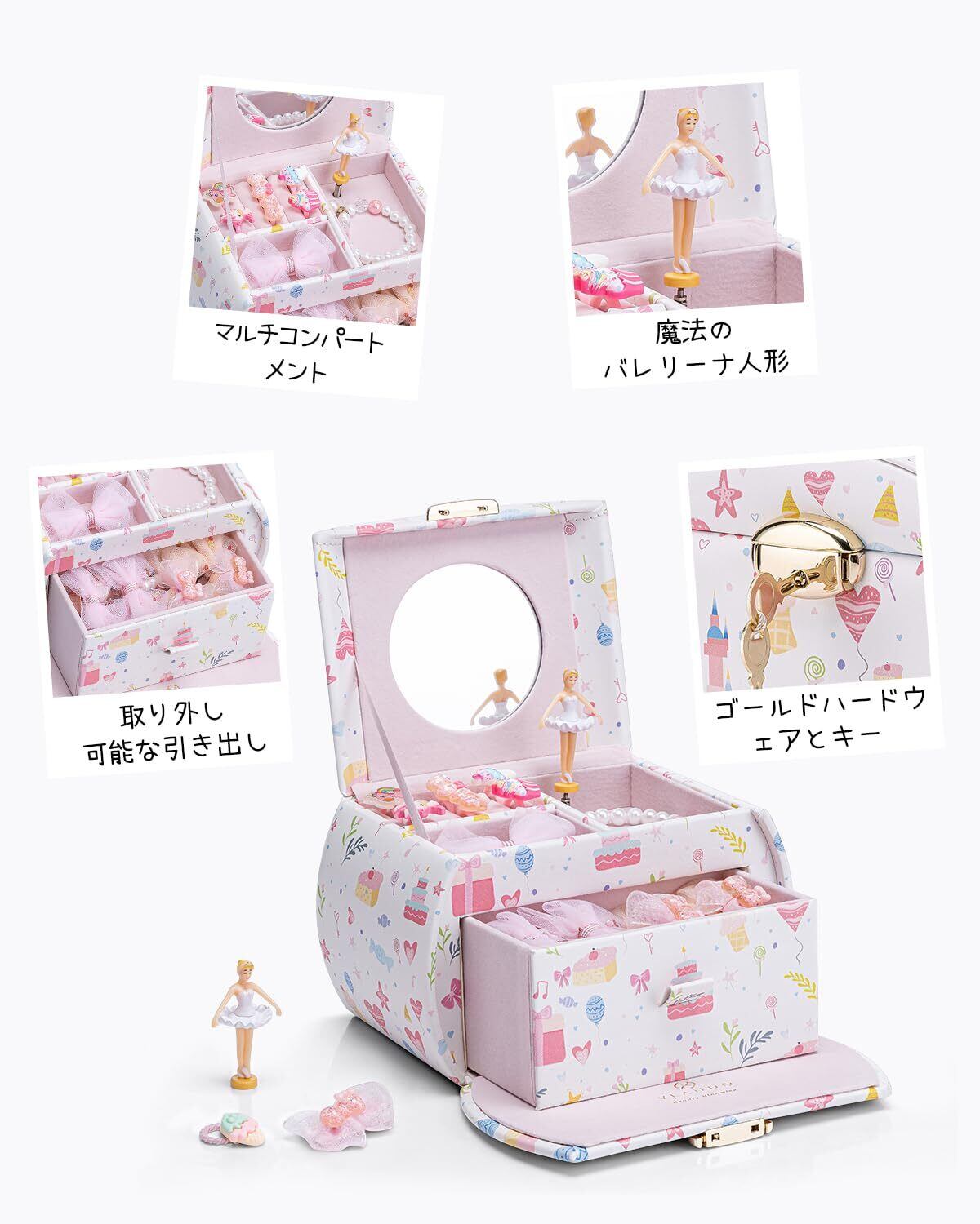 このジュエリーボックスは、七五三や誕生日、クリスマスなど特別な日の贈り物にぴったりです。お子様への愛情を込めたプレゼントとして、きっと喜ばれることでしょう。大切なアクセサリーを安全に保管し、成長と共に思い出を重ねられる一品です。