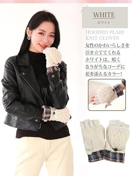 [エル, 2way, フード付き, ケーブル編み, チェック柄, ニット, 手袋, ミトン, 指切, フィンガーレス, レディース, クリスマス, プレゼント, ギフト, ケース付き]