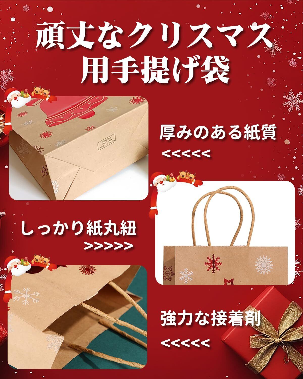 この手提げ紙袋は、クリスマスだけでなく、誕生日やお祝い事にも最適なアイテムです。大切な方へ贈る特別なギフトを、このかわいらしいバッグで包むことで、心のこもった贈り物として確実に喜ばれることでしょう。