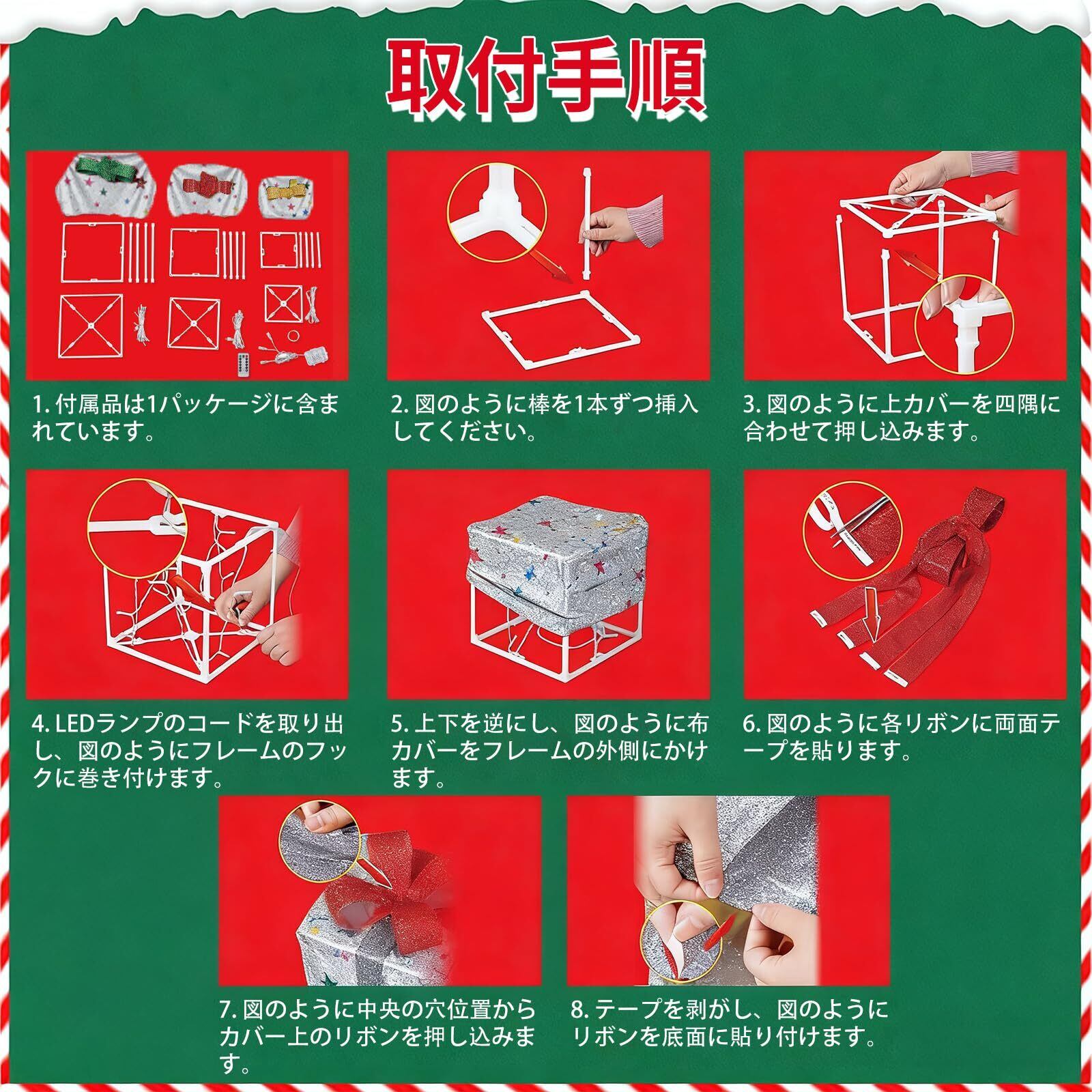 【クリスマス & 様々なシーンで活用可能】このクリスマスギフトボックスセット LEDライトは広く使用されており、クリスマス、ハロウィーン、パーティー、クラブ、ステージパフォーマンス、室内装飾、コーヒーショップ、大規模なパフォーマンス、宴会、記念日、家庭、オフィス、レストラン、ホテル、バー、結婚式などの機会に使用できます。 、また、クリスマスツリー、ポーチ、庭園、店舗などの装飾にも非常に適しており、非常に多用途です。※ 商品は出荷前に厳格な品質管理を行っておりますが、万が一お届けした商品に不具合が発生した場合、返金・無償交換いたします。製品に関して何か問題があった場合は、お気軽にご連絡ください。お客様のニーズに対応し、24時間以内にご返事いたします。お問い合わせ方法:「アカウントサービス」→「注文記録」→「販売者」→「質問」から弊店までご連絡ください。