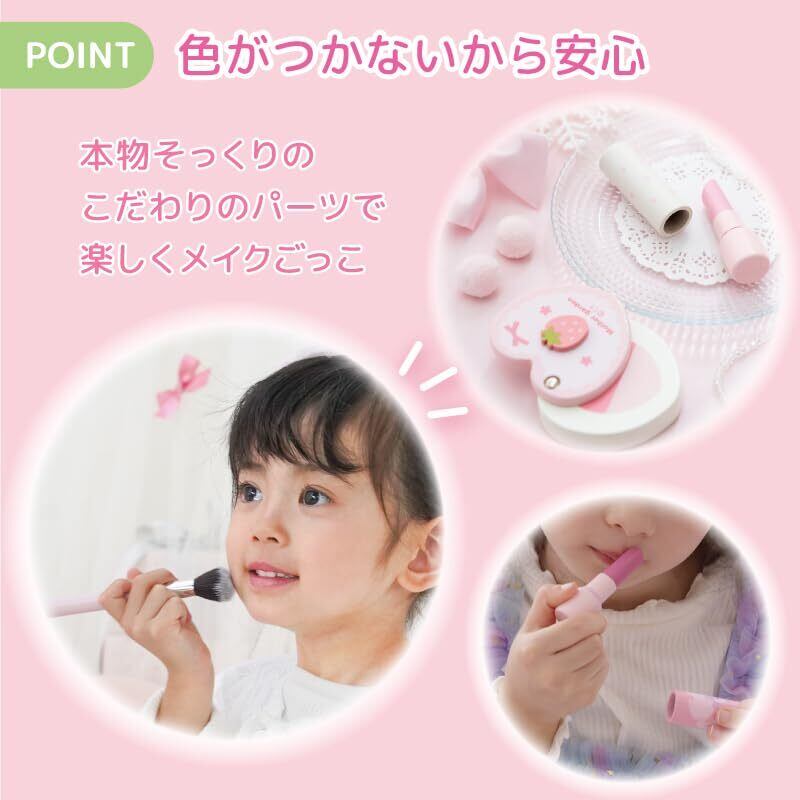 このメイクポーチセットは、安全な木製素材を使用し、やさしい手触りが特徴です。色がつかない仕様により、子どもたちが安心して楽しむことができます。耐久性にも優れており、長くご愛用いただける商品です。