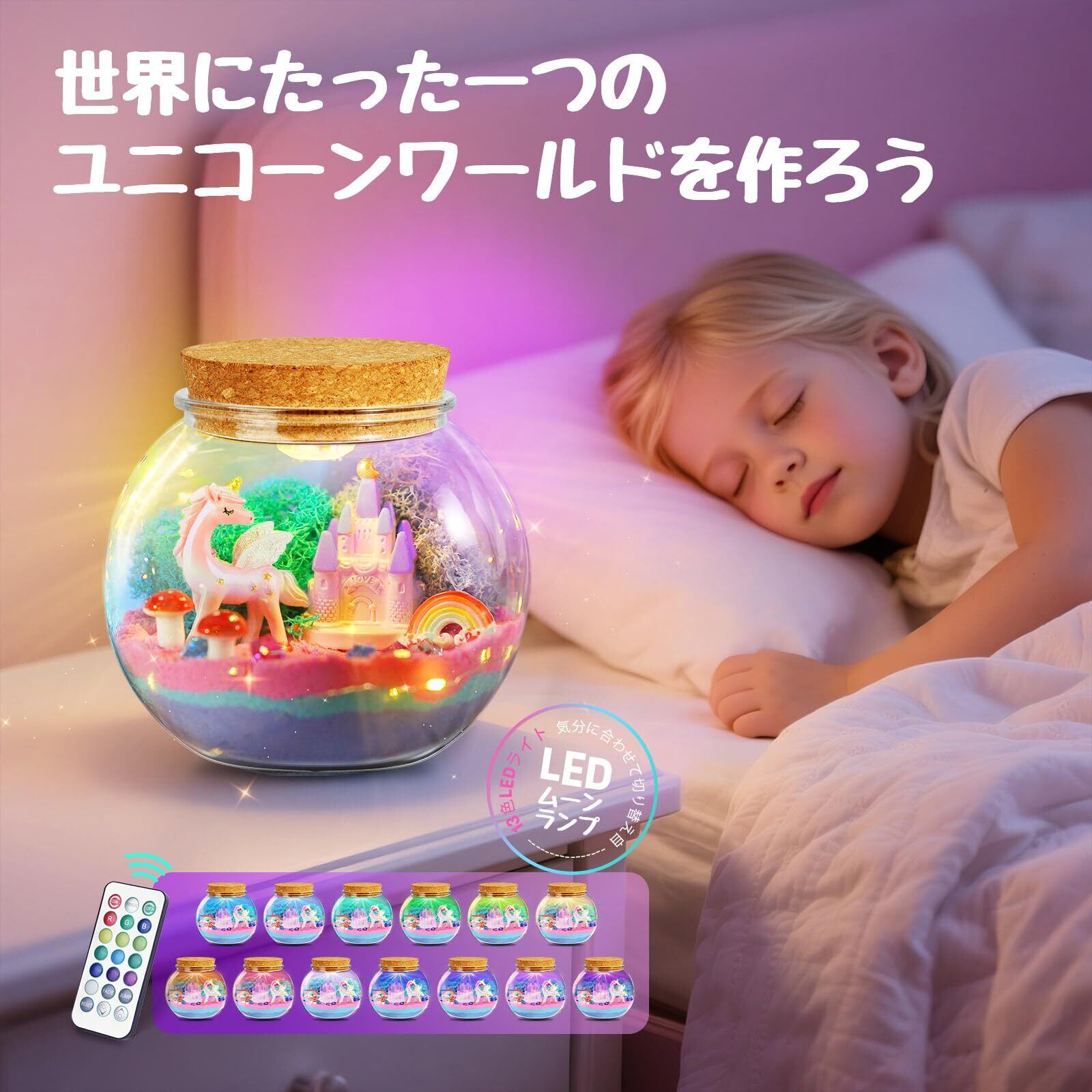 【ナイトライト付きテラリウムキット】このユニコーンテラリウムキットには、リモコン操作が可能な13色のLEDライトが付属しており、完成した作品を幻想的に演出できます。LEDライト付きのため、子供たちは自分で作ったミニチュアを夜でも楽しめます。リモコンで簡単に色や明るさを切り替えられるので、気分やシーンに合わせて雰囲気を自在にアレンジできます。お部屋を彩るインテリアライトとしても活躍する、魅力あふれるメイキングトイです。